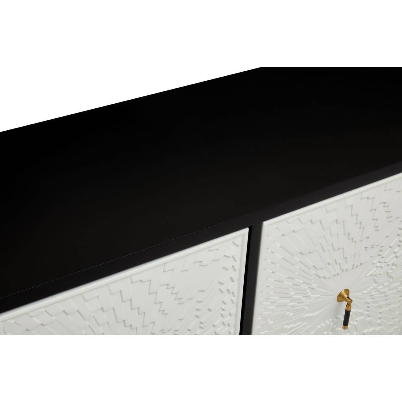 The Dumas four door sideboard has a mid century modern aesthetic that also fits well in contemporary spaces. It has a black top and white doors with a subtle pattern and gold knobs. The elegant structure is help up by a sleek gold base.