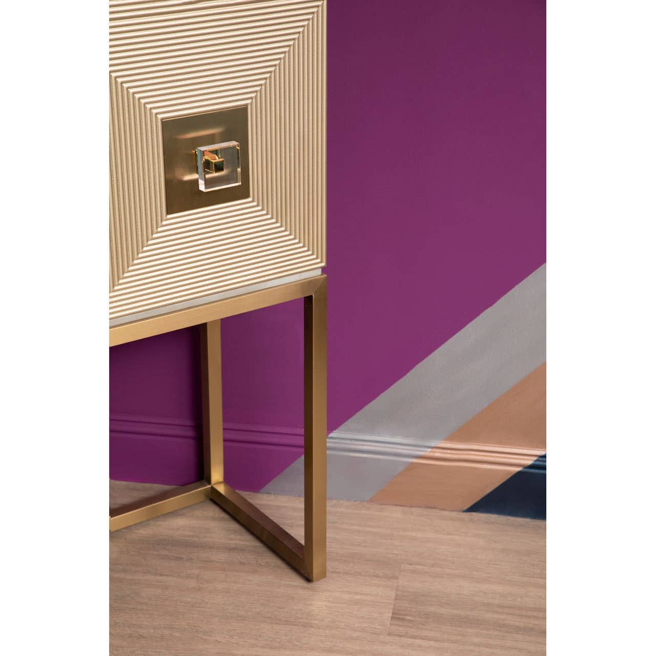 The Duvali cabinet features two textured doors in a sophisticated champagne silver finish. Each panel is accented with a recessed clear square handle. The cabinet offers practical storage with three internal shelves. The entire unit is elegantly supported by a sleek champagne gold metal leg frame, adding a glamorous and contemporary touch to any space.