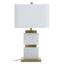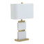 The Eira table lamp features a rectangular column design topped with an ivory shade. This table lamp stands atop a white marble pedestal base with a fusion of gold finish plating that makes a luxurious statement in the living room.