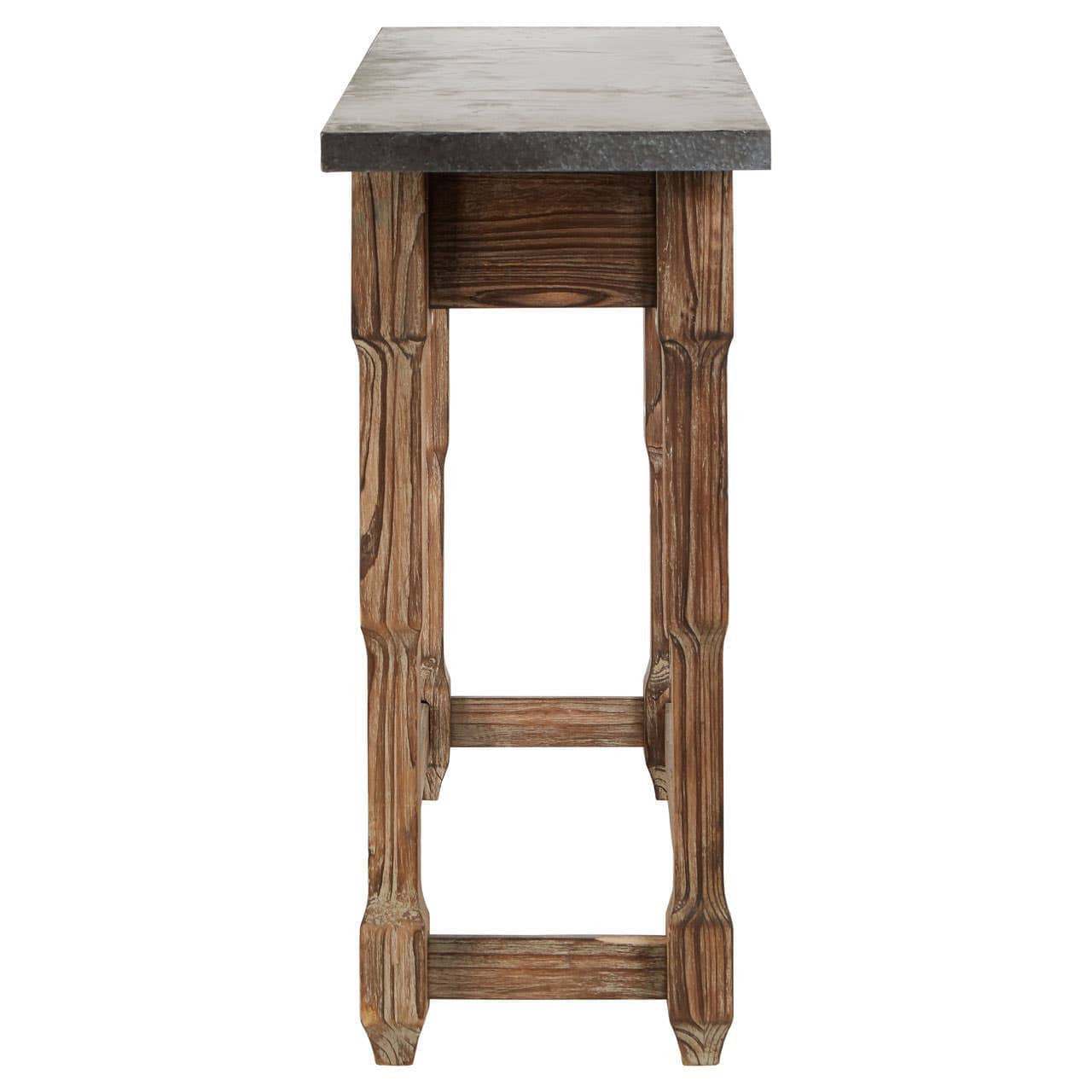 This is a charming antique wood effect console table featuring a grey metal top. The tabletop, with its textured grey finish, provides a robust counterpoint to the distressed, weathered-look wooden base. The table's design features carved legs, evoking a rustic or traditional farmhouse appeal.