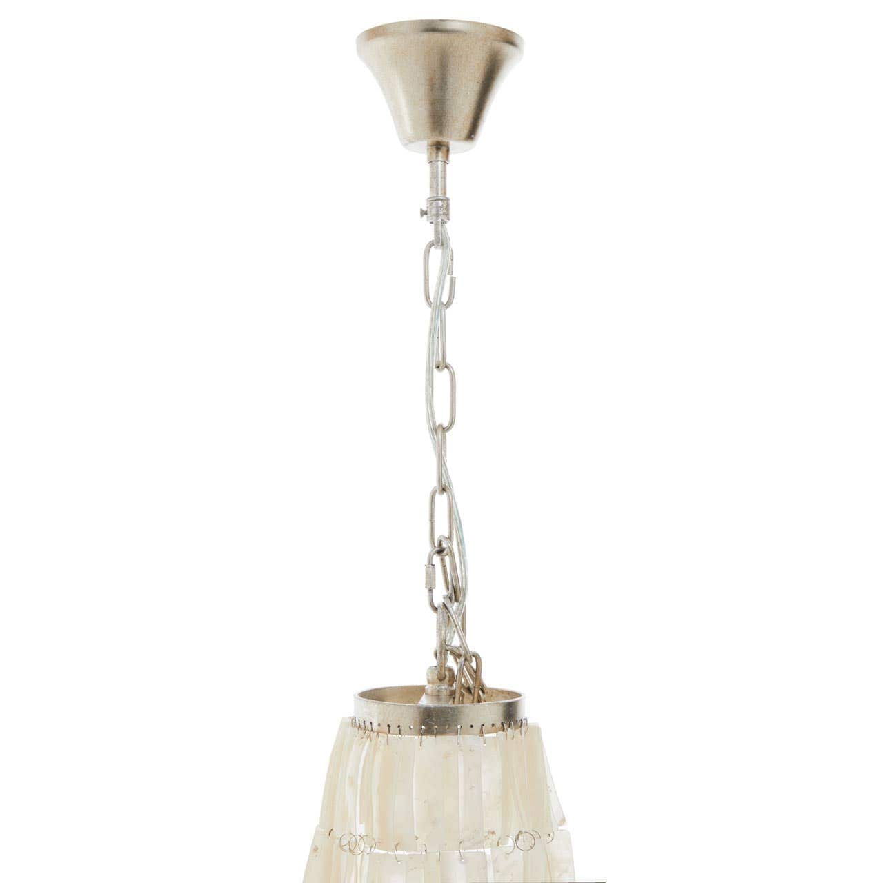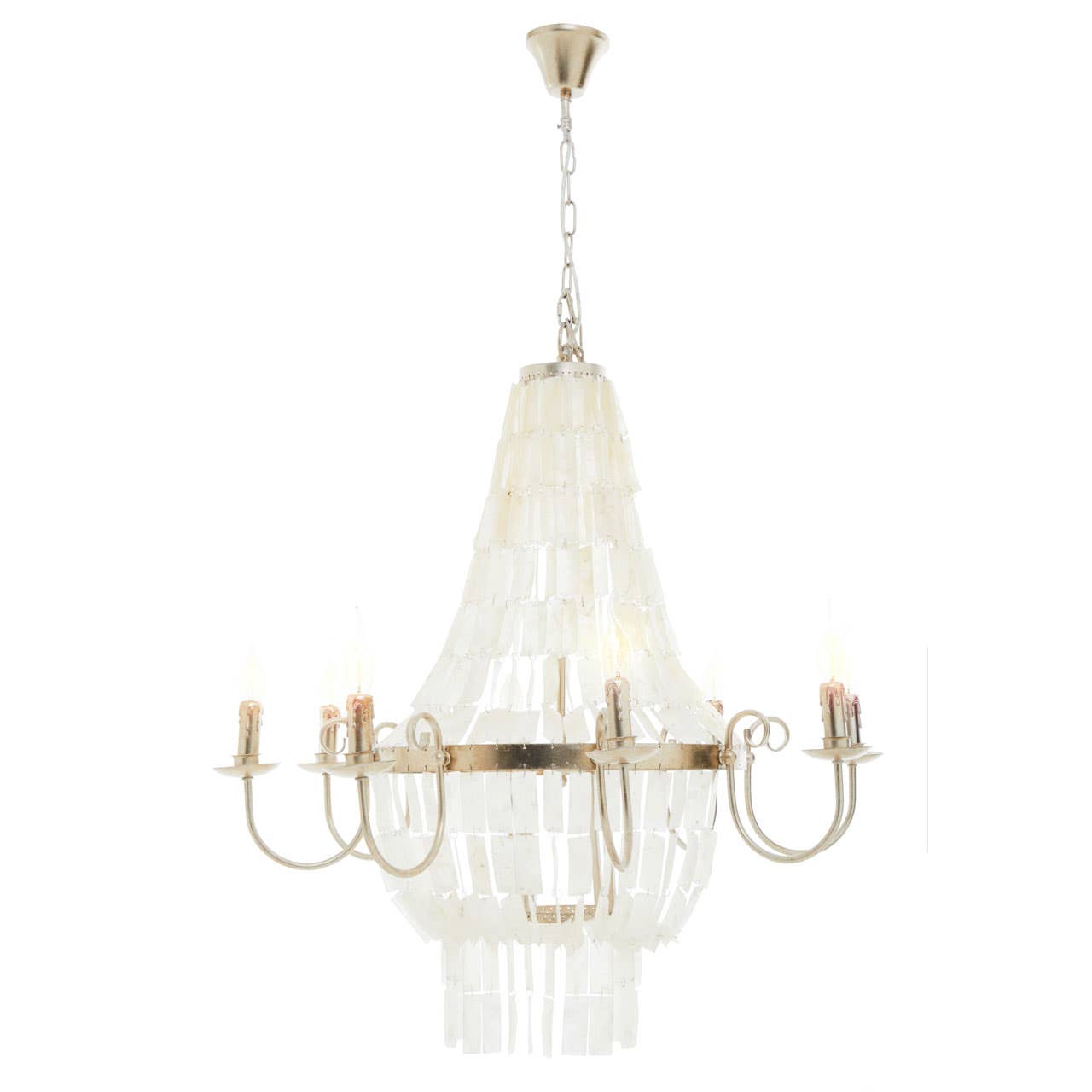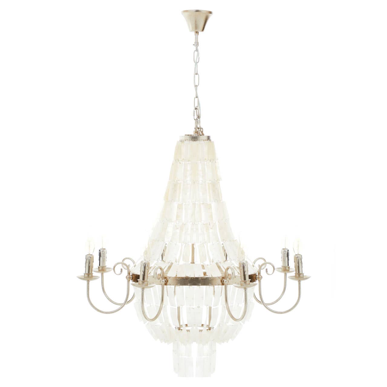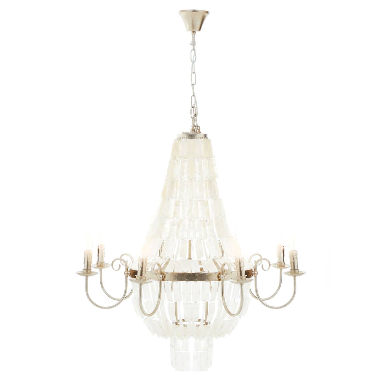 Inspired by traditional and antique features, this handcrafted chandelier will make a statement in the living room. The cascading seashells fixed in a silver leaf finish metal frame boast eight candelabra lamps and form a teardrop shape.