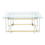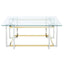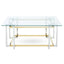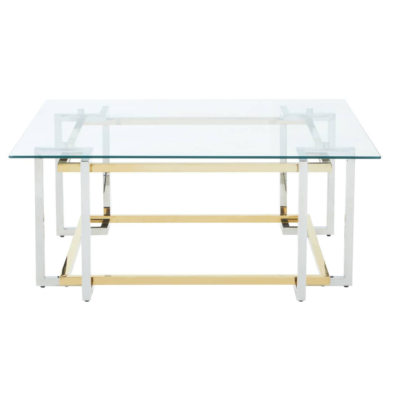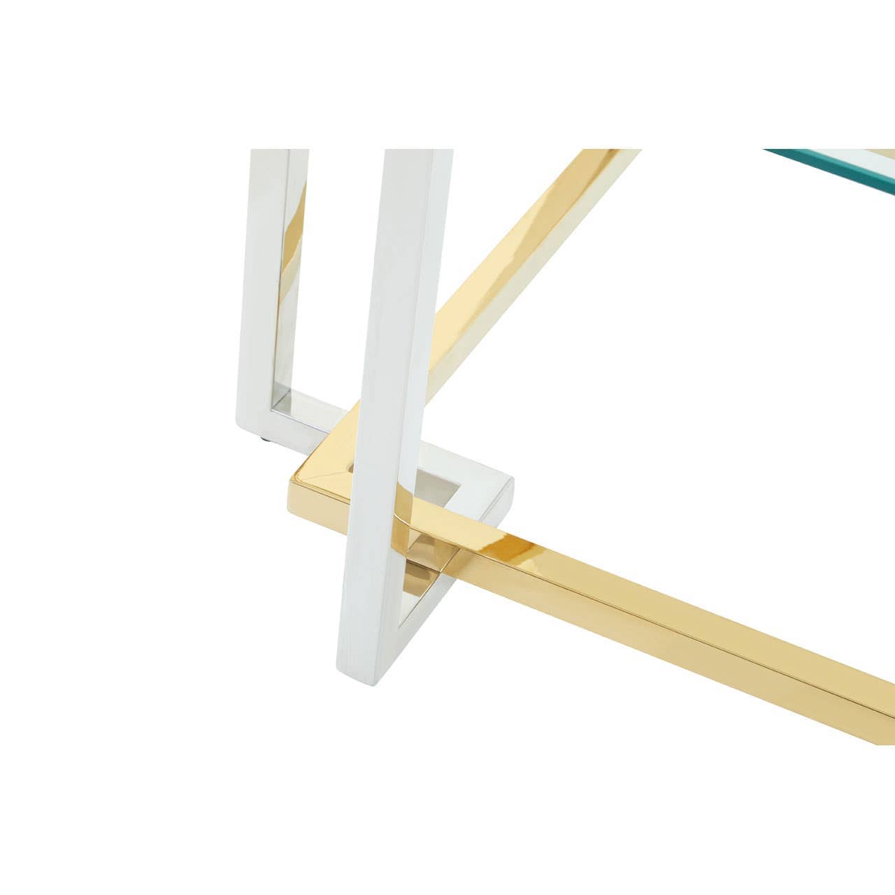This coffee table lends a chic accent to the living area with its clear tempered glass top. The robust stainless steel intersecting base in the silver and gold finish exhibits a geometric appeal that creates an art deco Alustre to a range of homes.