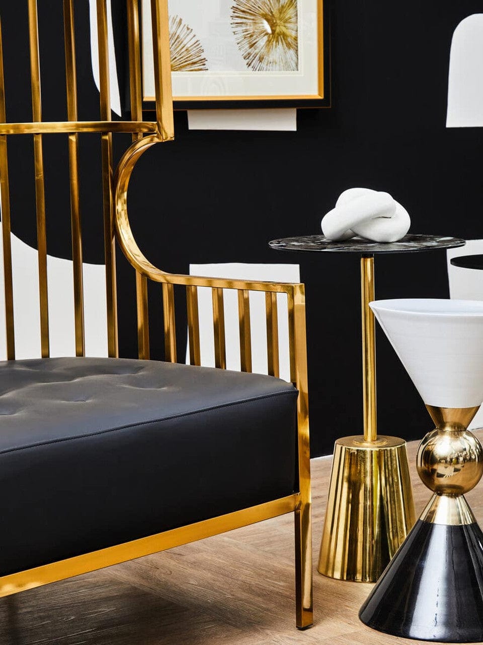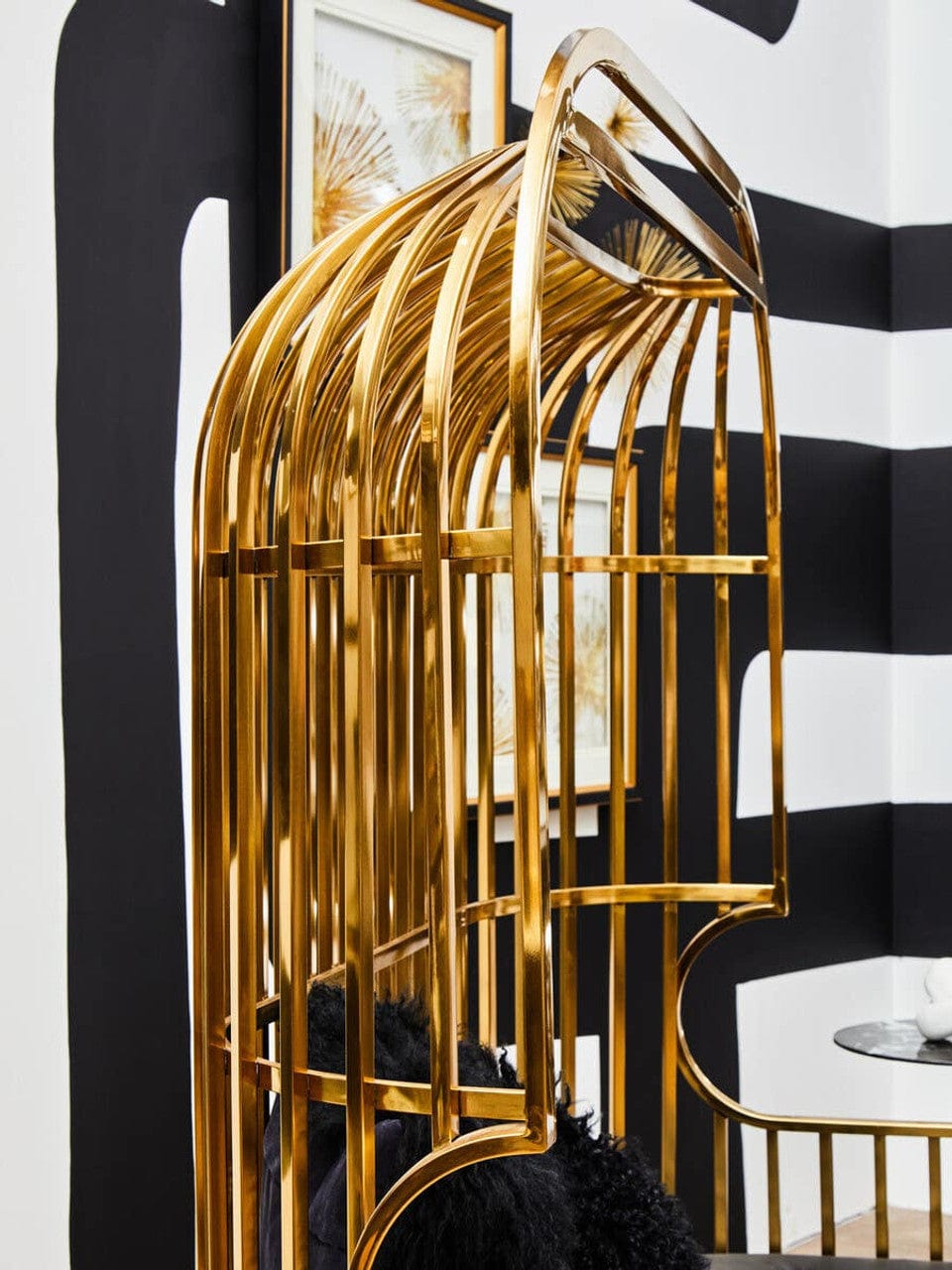 With a bird cage like design in reflective gold finish, this two seat sofa features cage bars which combine from the top to form a dome shape over the chair. Generously cushioned seat is covered in black faux leather and contrasts the high shine polish to make a statement.