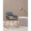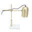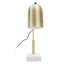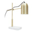 This desk lamp has a rounded warm metallic metal shade connected to an adjustable arm and cord-line switch. The sleek arm gently intersects the chrome stand that is supported by a rectangular white marble base.