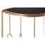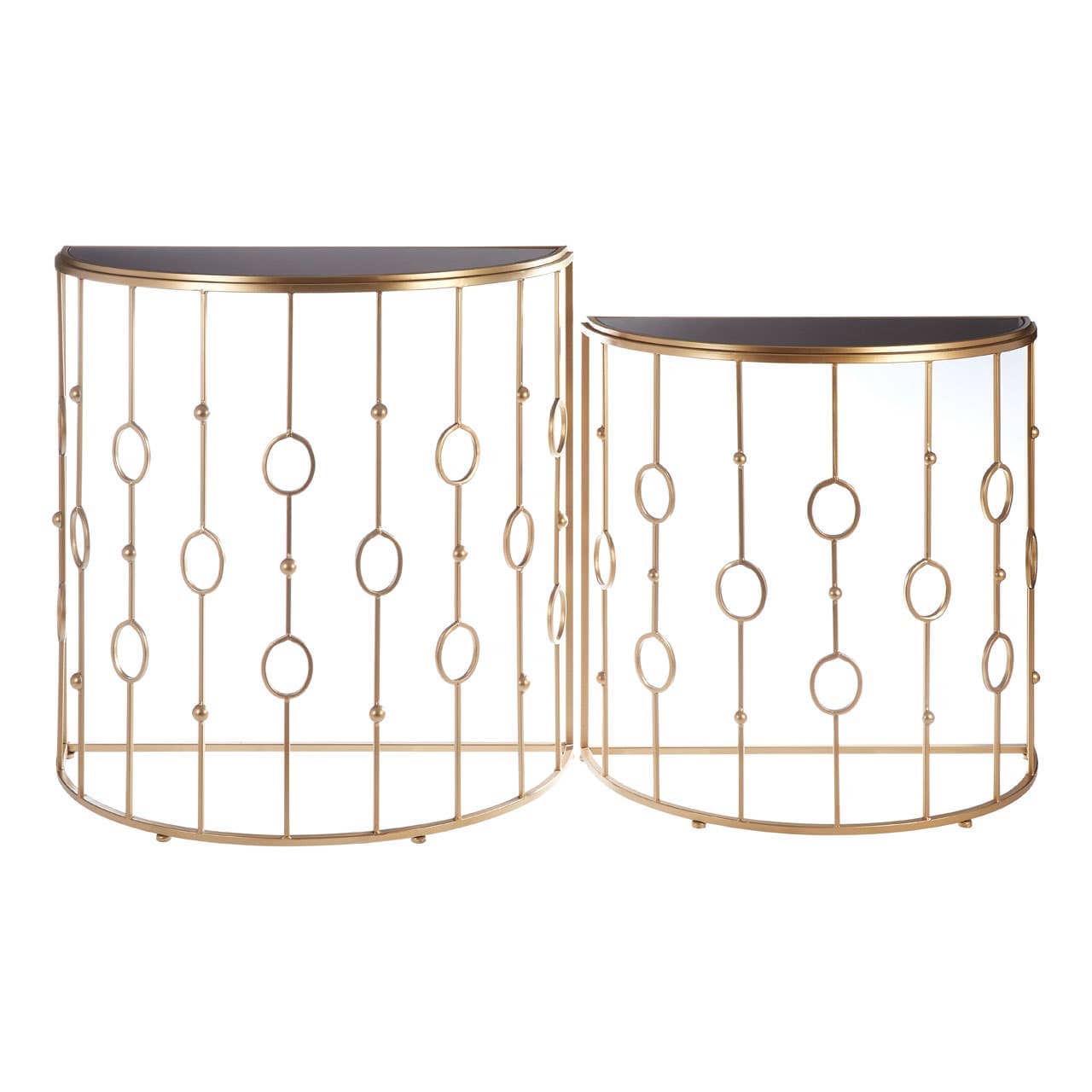 Both tables have a half moon design, with frames made from smooth metal that boasts a rich gold finish. The slim vertical lines are interrupted by hoops to give the tables a hint of art deco style. Their tops are made from glass, coloured black to complement the gold. Display them as part of a luxe design theme.