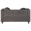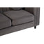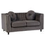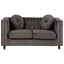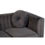 A contemporary design piece, the Farah sofa has a square, boxy appearance. Vertical channel tufting creates a pleat effect on the back and armrests, adding a subtle decorative detail. The sofa is supported by four sustainable eucalyptus wood feet with a sleek black finish. Two round, button-tufted cushions enhance the sofa's elegant appeal.
