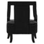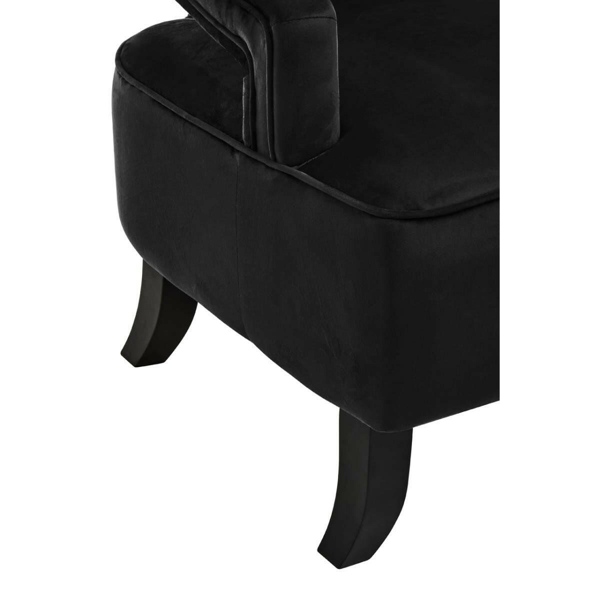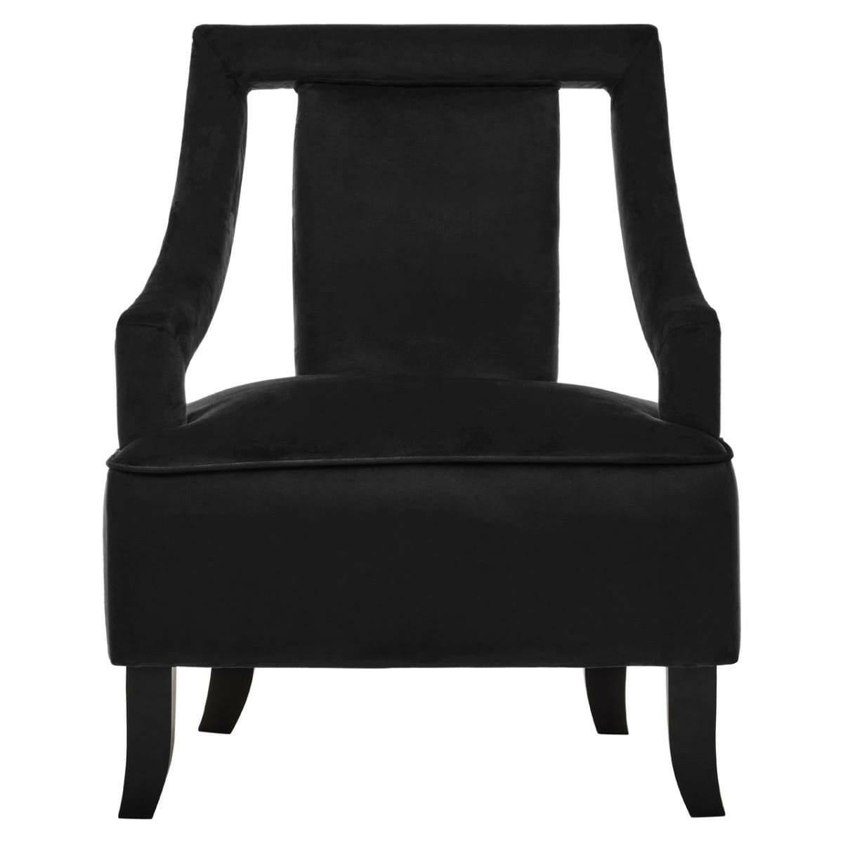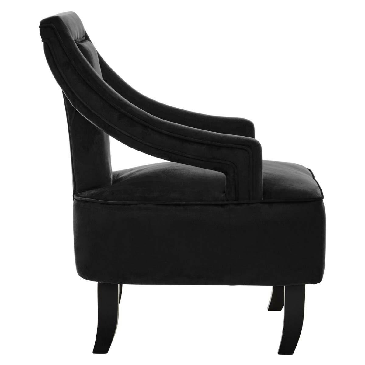 This black velvet chair is a combination of vintage and mid-century modern aesthetic. The foam padded and inward curving armrests add comfort. The design and wooden legs make this chair suitable for classically inspired decor.