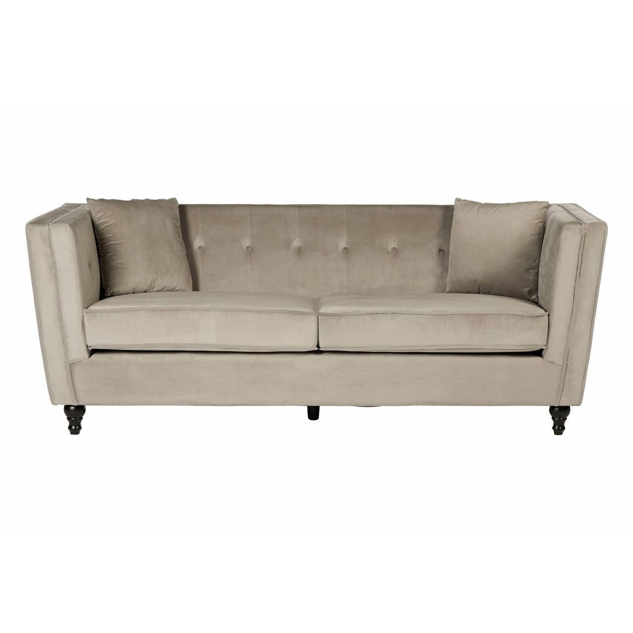 Boasting a distinctive tapered design, the three seat Ferris sofa has a slimmer bottom and wider top with straight, angular edges. The sofa is upholstered in soft mink velvet fabric, with complementary brown piped trim.
