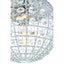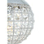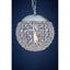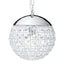The light's orb structure is produced by an iron framework, topped by a crown of reflective chrome metal. Beads of sparkling crystal glass are entwined throughout the frame, with corresponding hexagons creating a refractive raiment. A single Edison style bulb casts a warm glow, while the light is held securely by a strong chrome chain.