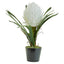 This white tropical plant with lush foliage is placed into a black ceramic pot filled with faux moss. Emerging from a cluster of verdant leaves, the plant in milky colour and texture will supply the finishing flourish in a botanical setting.