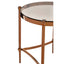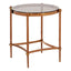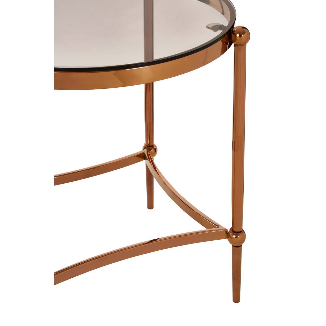 This table has rose gold finish stainless steel frame featuring clean and simple lines which gently taper to form pointed ends. A round brown tempered glass top rests above the luxe base and is secured with orbs around its contoured corners.