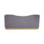 The Franza three seater sofa has muted grey upholstery with thick padding and two matching cushions. The undulating back features pleated detail and a warm metallic band on the lower front adds to its luxurious look.