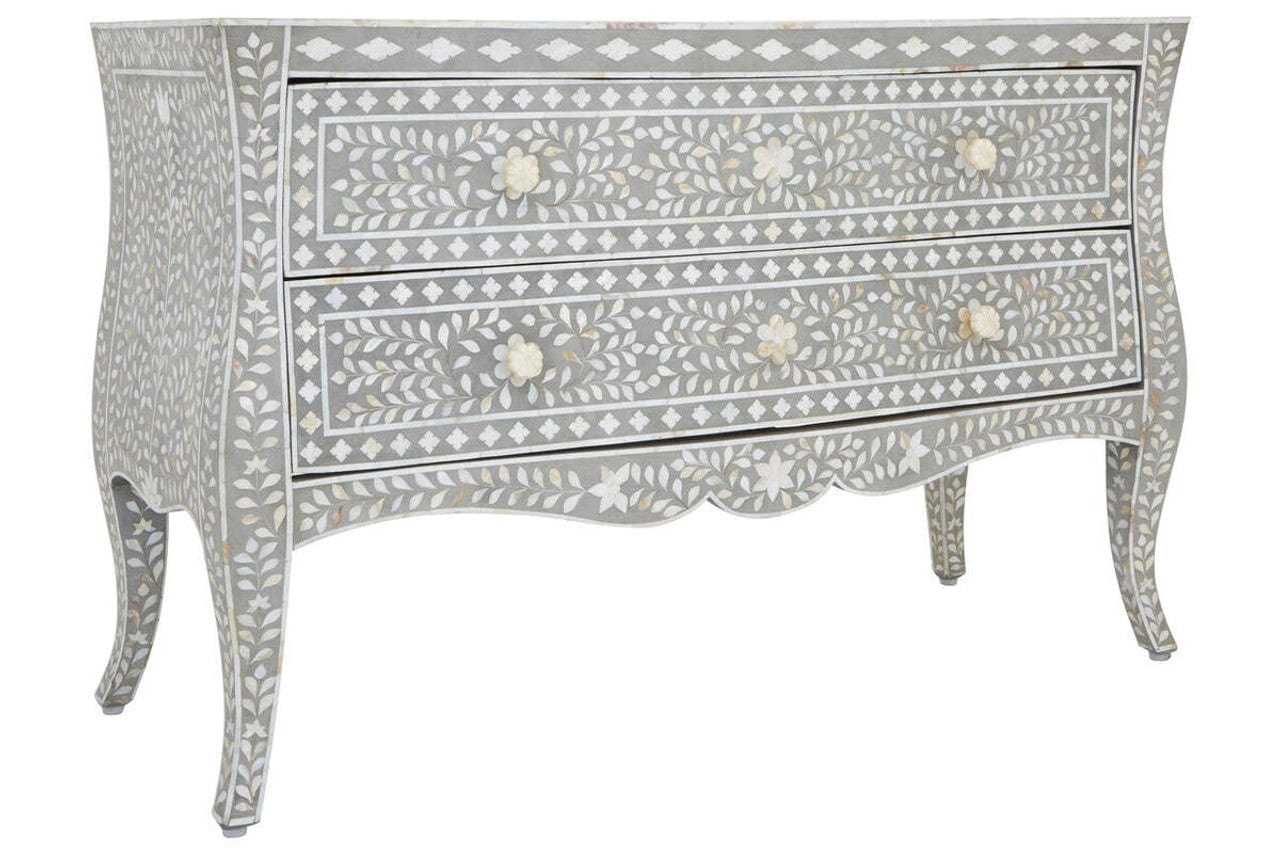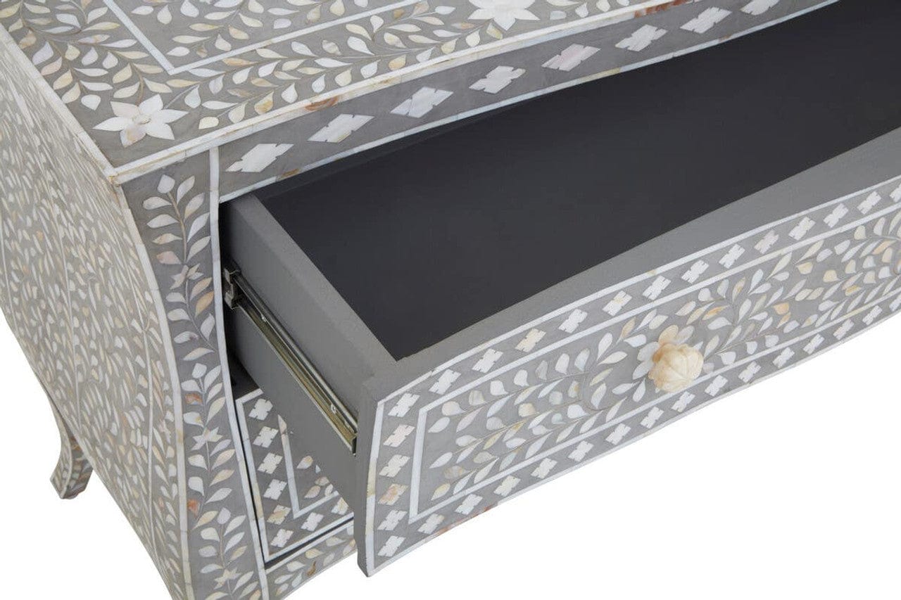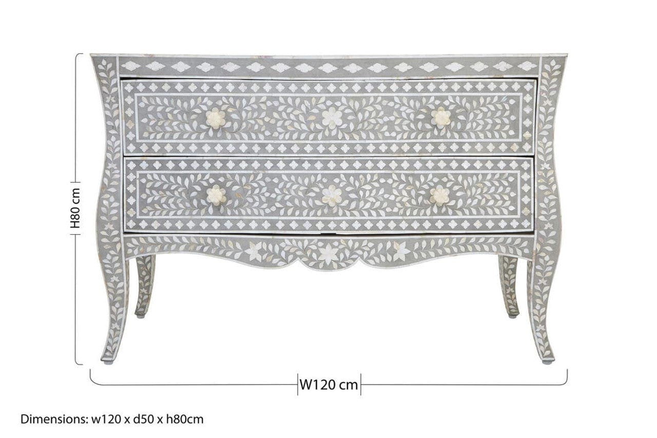 Handcrafted in India by skilled artisans, our Classic Mother of Pearl Inlay chest of drawers is crafted from sustainable mango wood the individual pieces of mother of pearl have been lovingly hand carved and set into dove grey resin to create a beautiful floral design. Featuring two wide drawers, ideal for storing clothes and linens that are perfect for organising and storage . The unit is elegant with the curvature of its cabriole legs and the statement piece will add style and flair to your home.