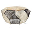 The coffee table's octagonal top is created from sustainable mango wood and boasts a light colour and prominent graining characteristic of the natural material. Rasied from the ground by small feet, the black metal base forms a distinctive faceted shape comprised of a series of pentagons. Each pentagon features woven cotton cord in contrasting black and white colours.