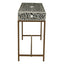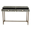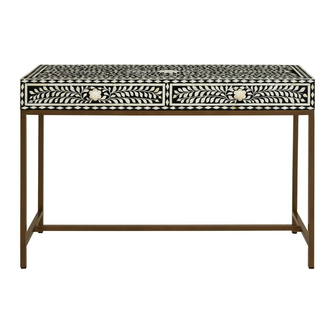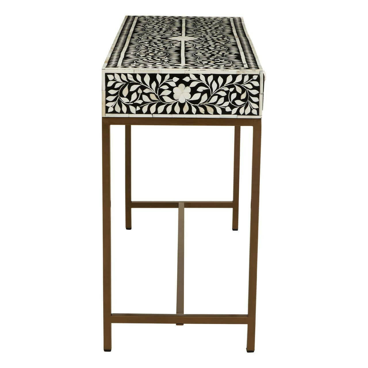 This console table features an intricate floral pattern made from individually laid white bone on solid black wood. Two drawers, each with a floral grip, enhance the timeless appeal of the design. A sturdy gold finish base adds stability and counterpoints the traditional aesthetic with a modern and minimal look.