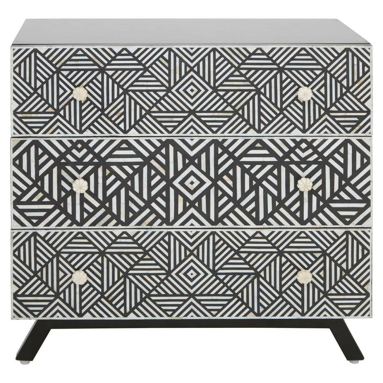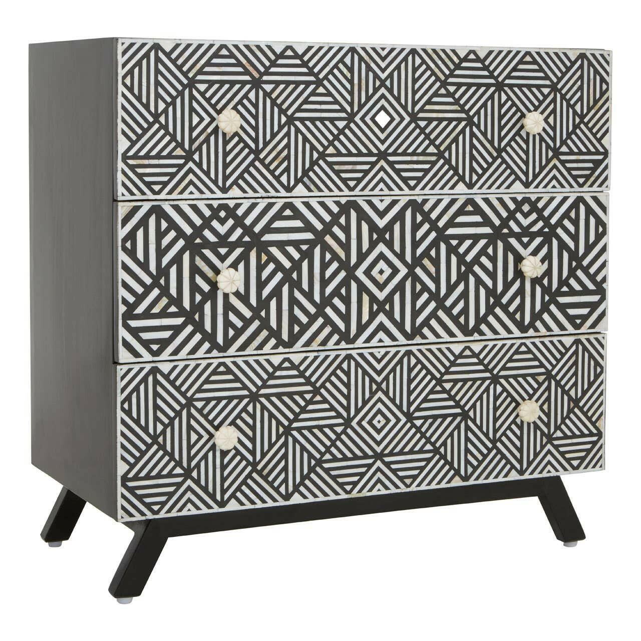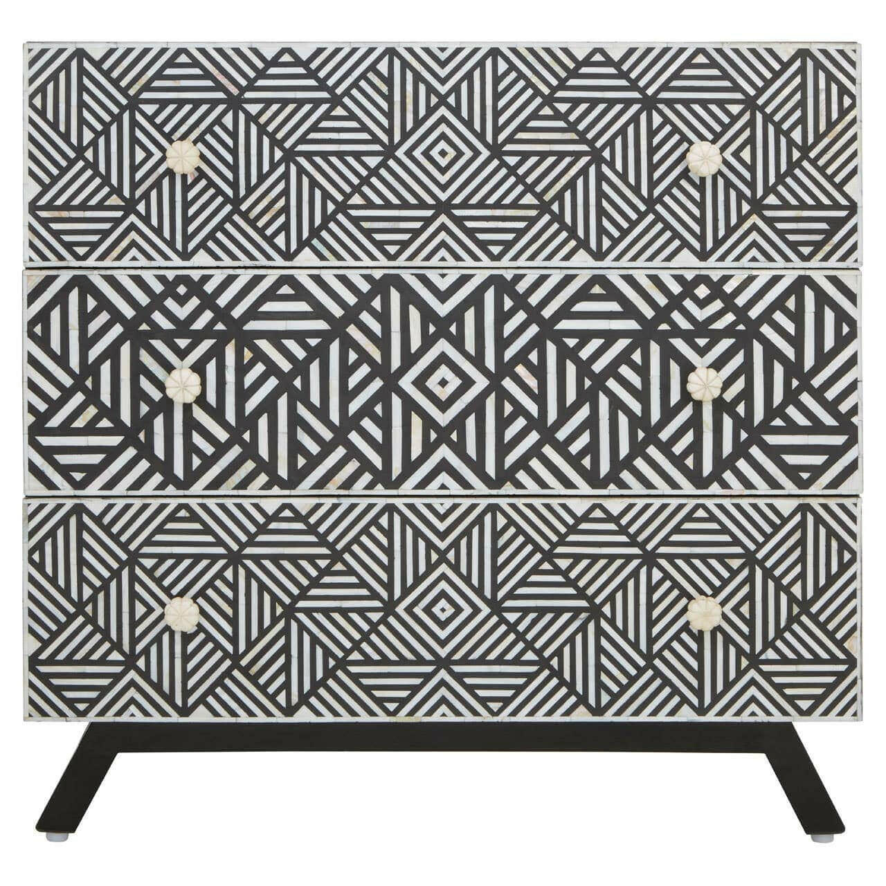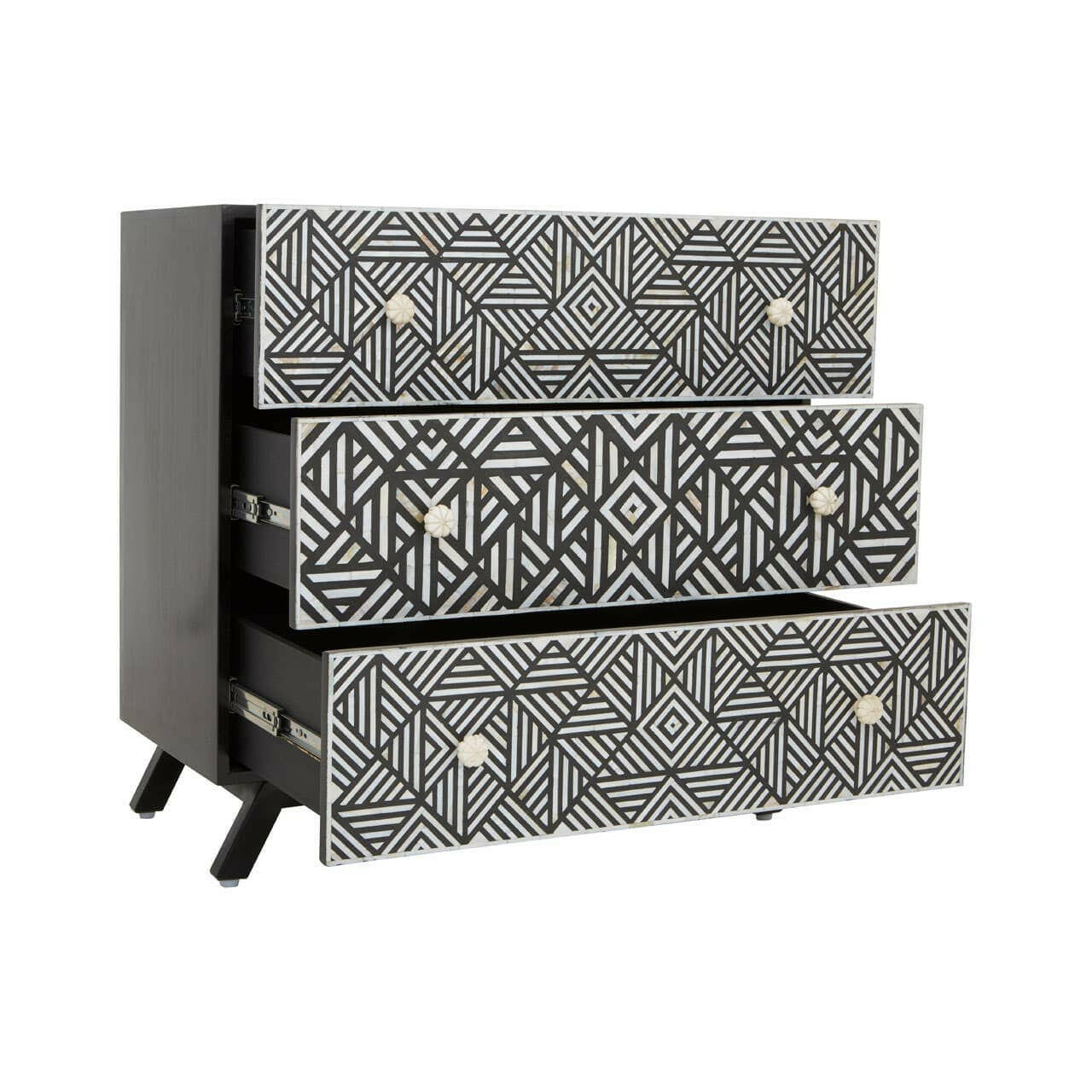 The Fusion Monochrome Chest of Drawers boasts intricate hand-carved detailing made from renewable mangowood. The sleek black finish adds a modern touch while the monochrome geometric pattern adds a timeless appeal.