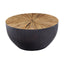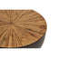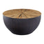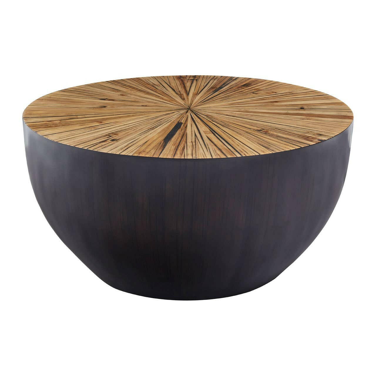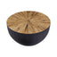 Handcrafted from bamboo, this small coffee table features smooth sides with a sleek edge. The countered base in dark ebony and natural shade contrasts the decorative sunburst pattern on the rounded top and elevates natural charm and style.