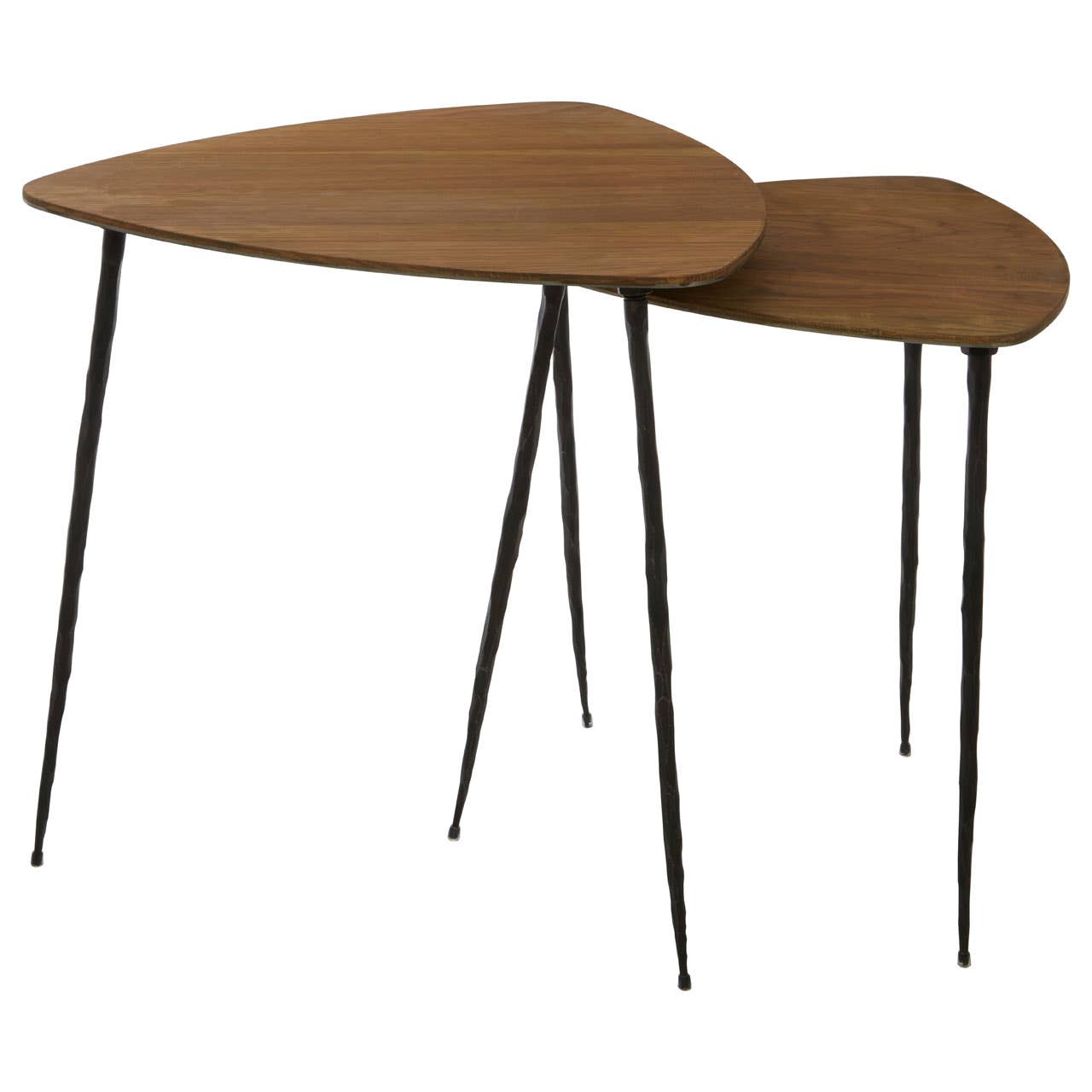 These tables have triangular oak veneer tops which are slightly curved from sides and boast a rich grain pattern that contrast with the antique hues of the legs.