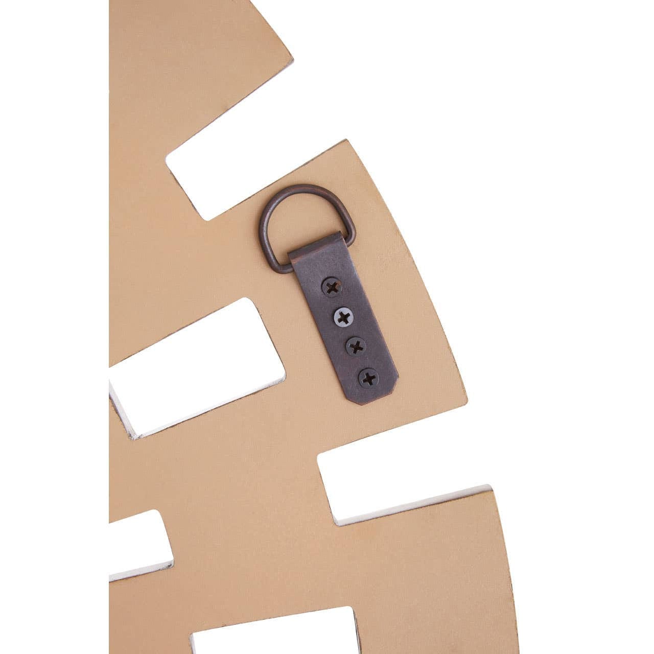 Its frame is made from natural wood and boasts an antique silver finish for a distressed metallic look. The four circles that comprise the frame are symmetrically aligned. Each circle features a series of rectangular blocks.