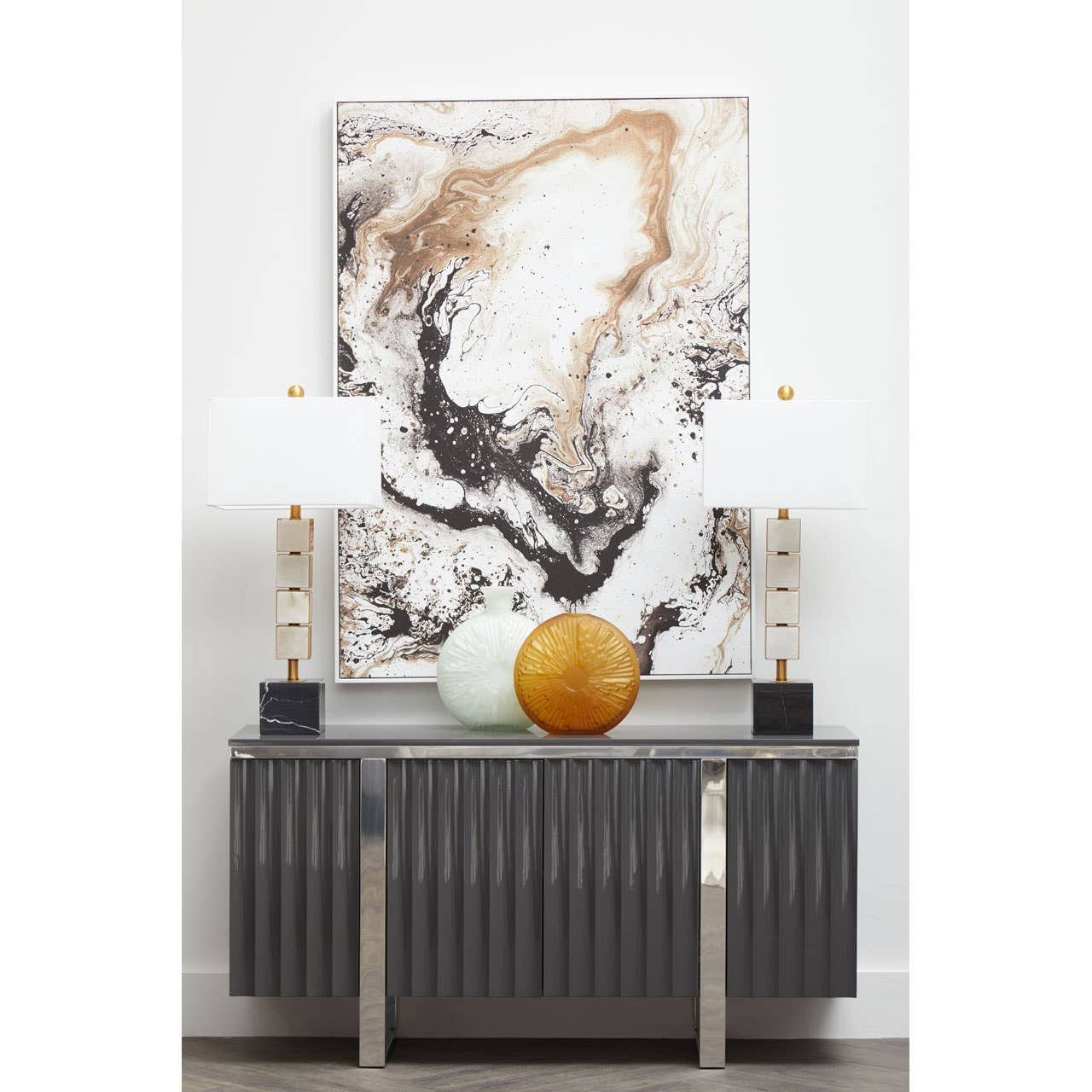 This is a modern and elegant sideboard with a sleek design. It features four doors with a beautiful high-gloss grey fluted texture. The sideboard is supported by a minimalist and sturdy polished stainless steel frame, making it a stylish and functional storage solution for any contemporary space.