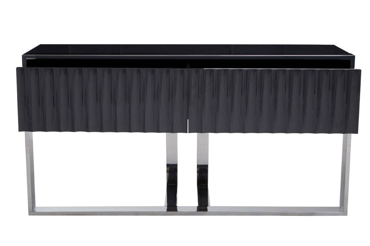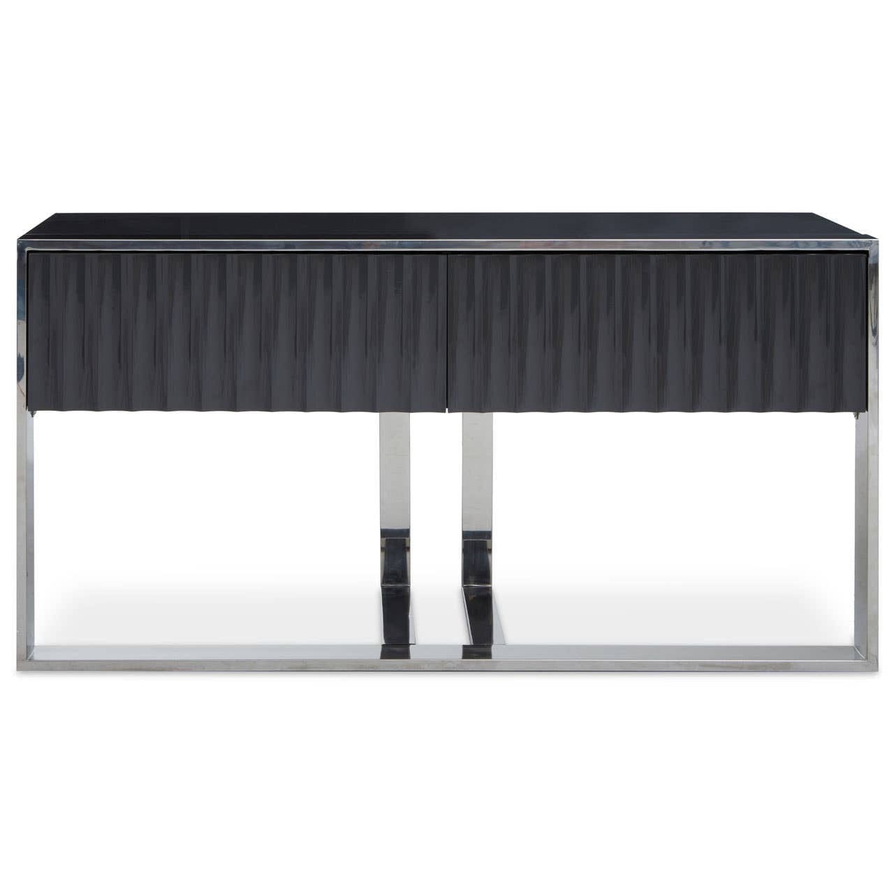 This is a stylish and contemporary console table with a sleek design. It features a high-gloss grey fluted front that conceals two spacious drawers or doors, offering a unique and textured look. The table is supported by a minimalist, polished stainless steel base, making it an elegant and functional addition to any modern hallway or living room.