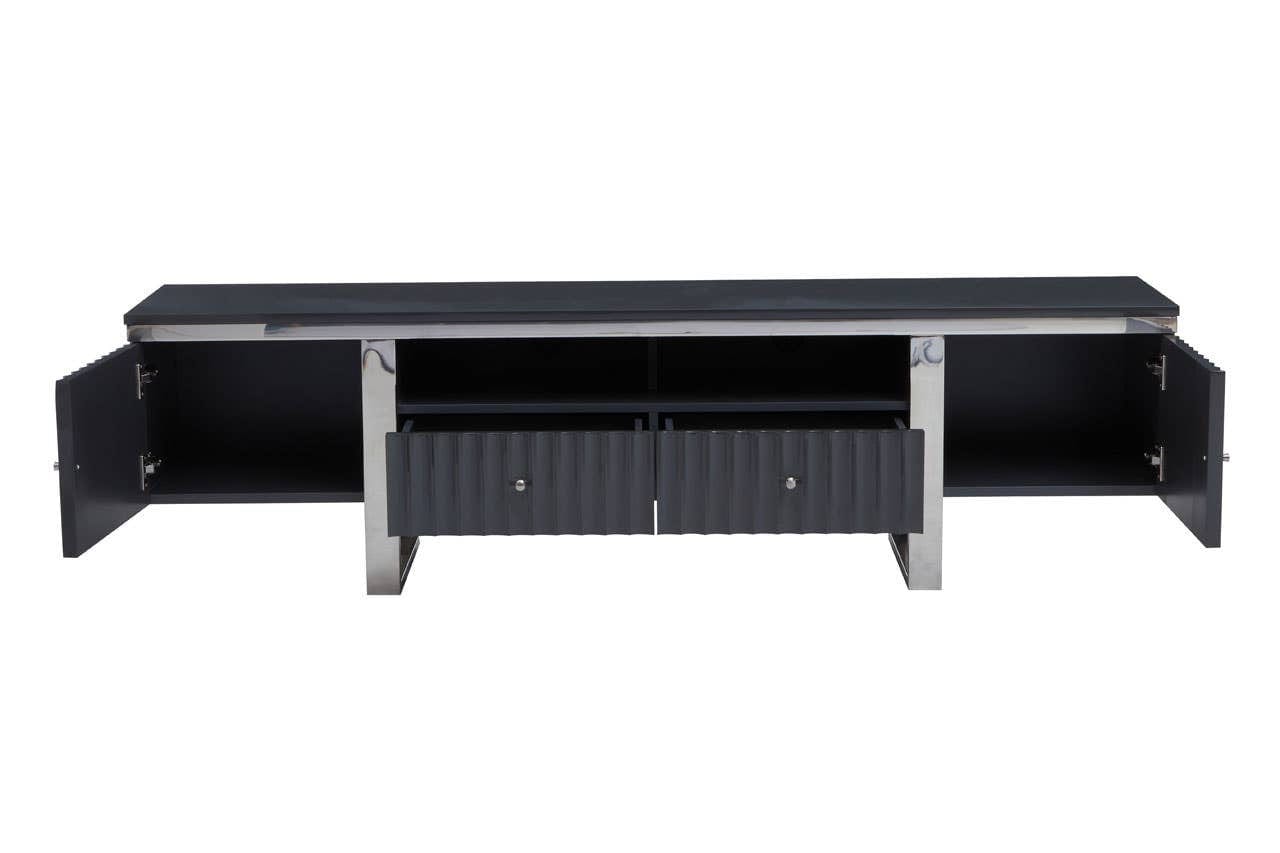 This is a sleek and modern media unit with a high-gloss grey finish. It features a unique fluted design on the drawer fronts, offering a textured contrast to its smooth top. The unit is supported by a polished stainless steel frame, making it a stylish and functional piece for a contemporary living room.