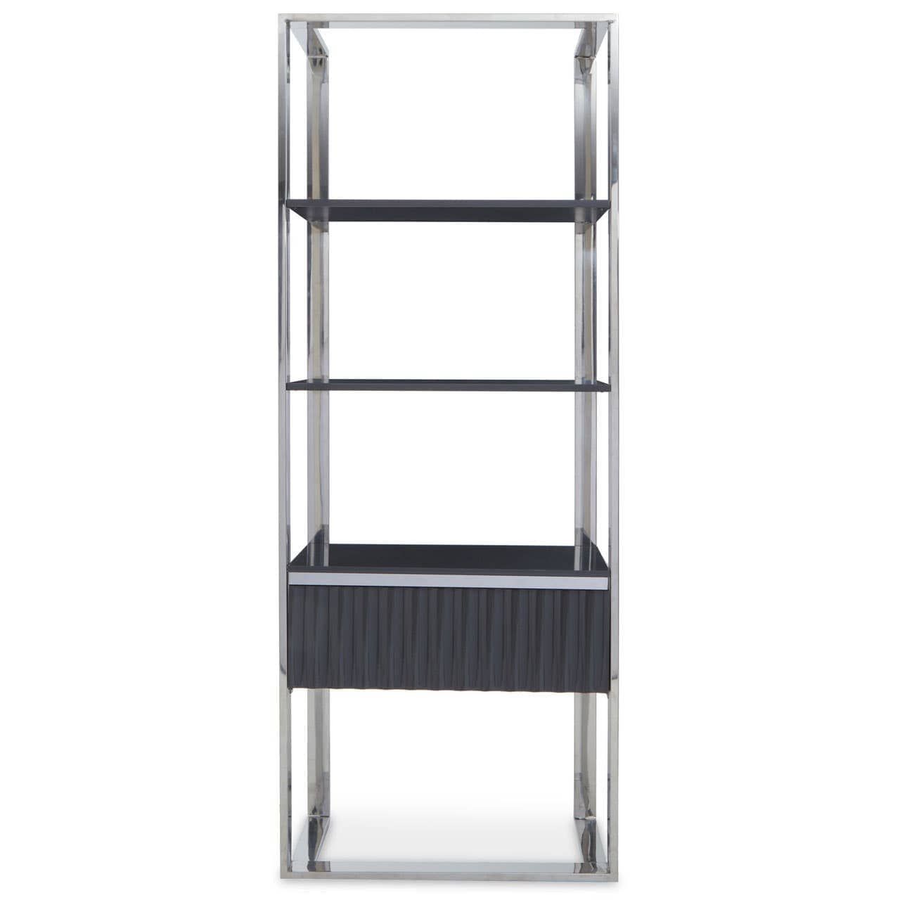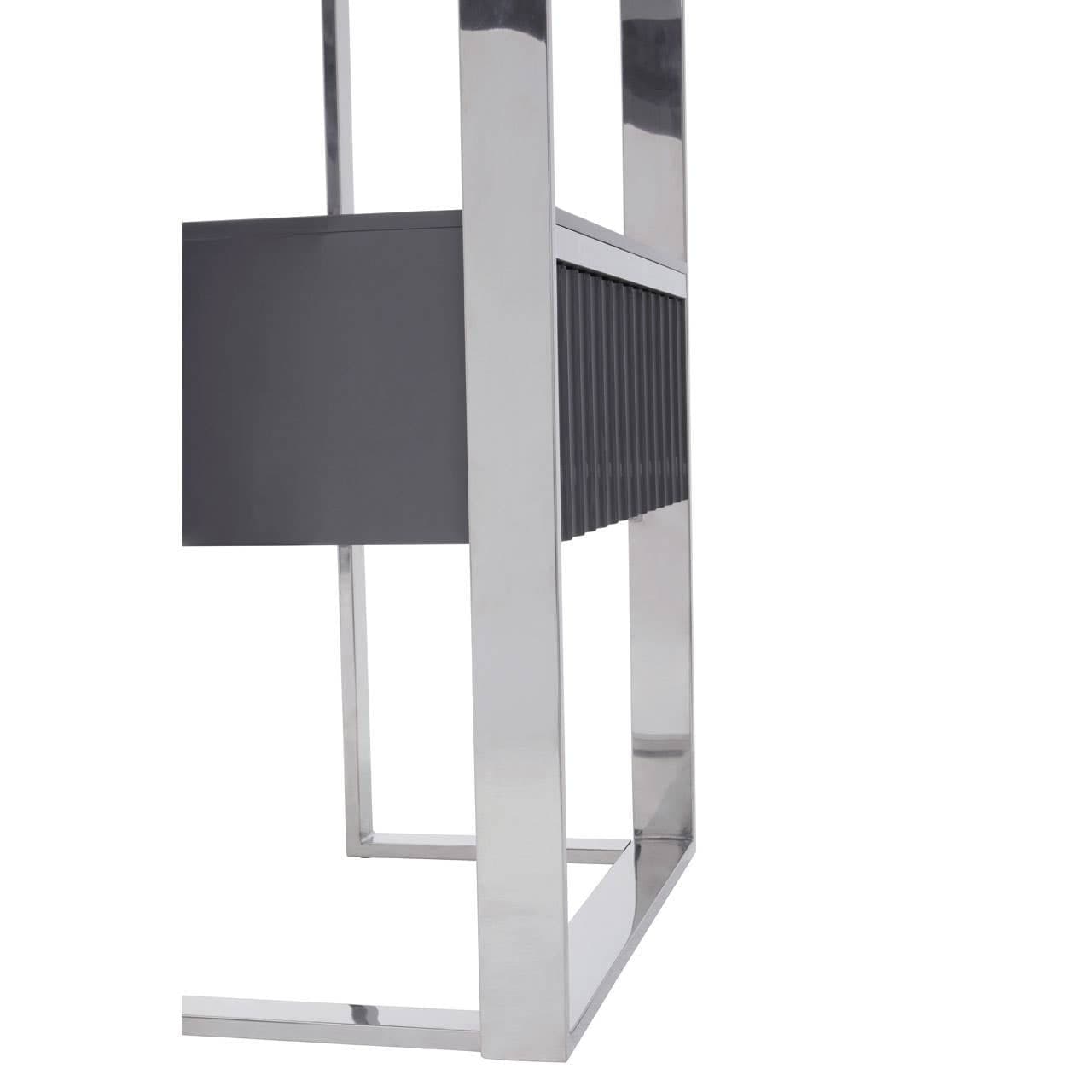 Elegant and sophisticated, this shelf unit features a polished stainless steel frame having three shelves. The high-gloss grey storage drawer featuring a decorative fluted pattern forms a monochrome contrast with the steel frame.