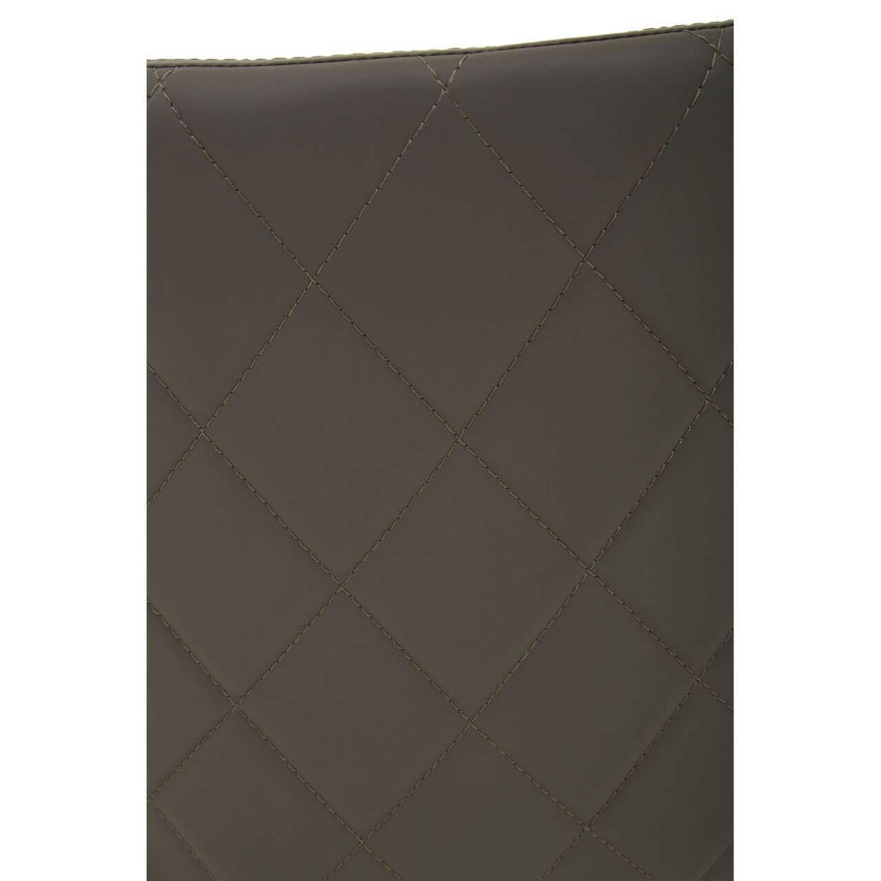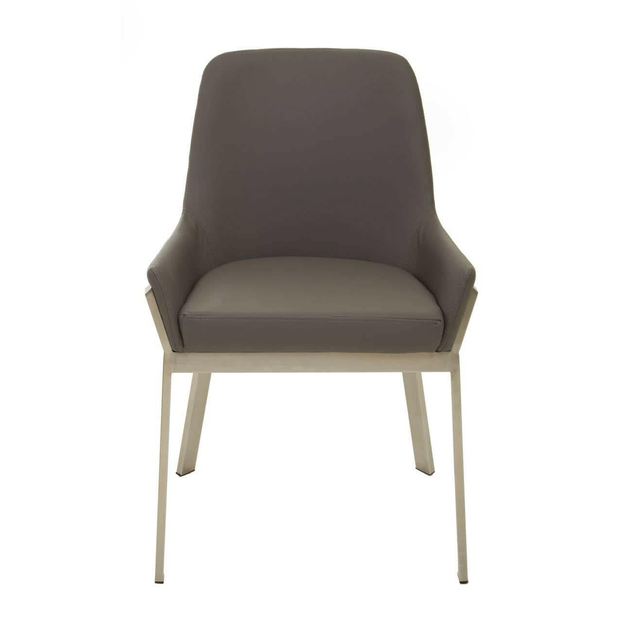 This chair has a soft padded seat with flared arms and a tapered backrest. The grey leatherette contrasts the sleek and angular legs in brushed silver finish that create an elegant look.