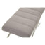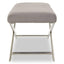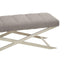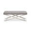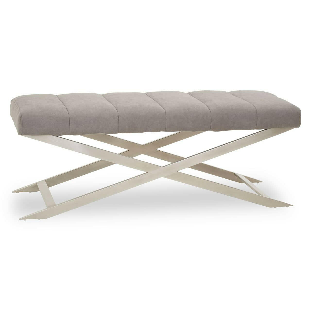 This bench exudes modern sophistication with the elegant base forming a cross design in the brushed silver finish. The clean, intersecting base support a grey fabric seat in dense padding and minimal channel tufting. A perfect end of bed bench seat.