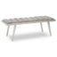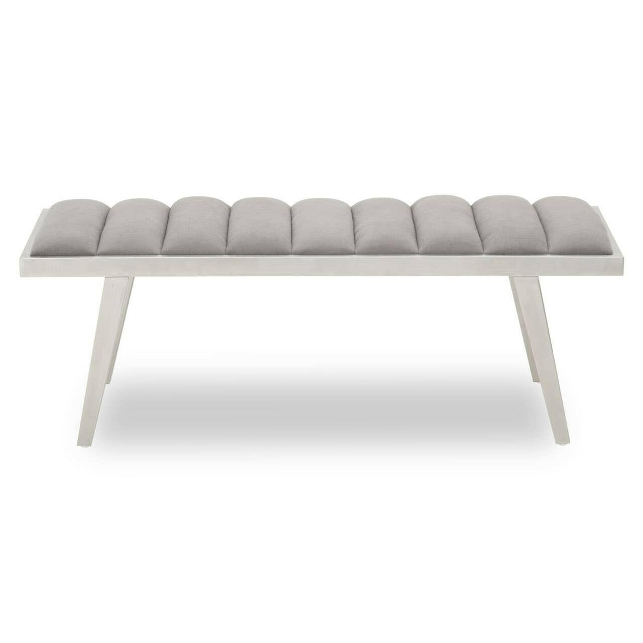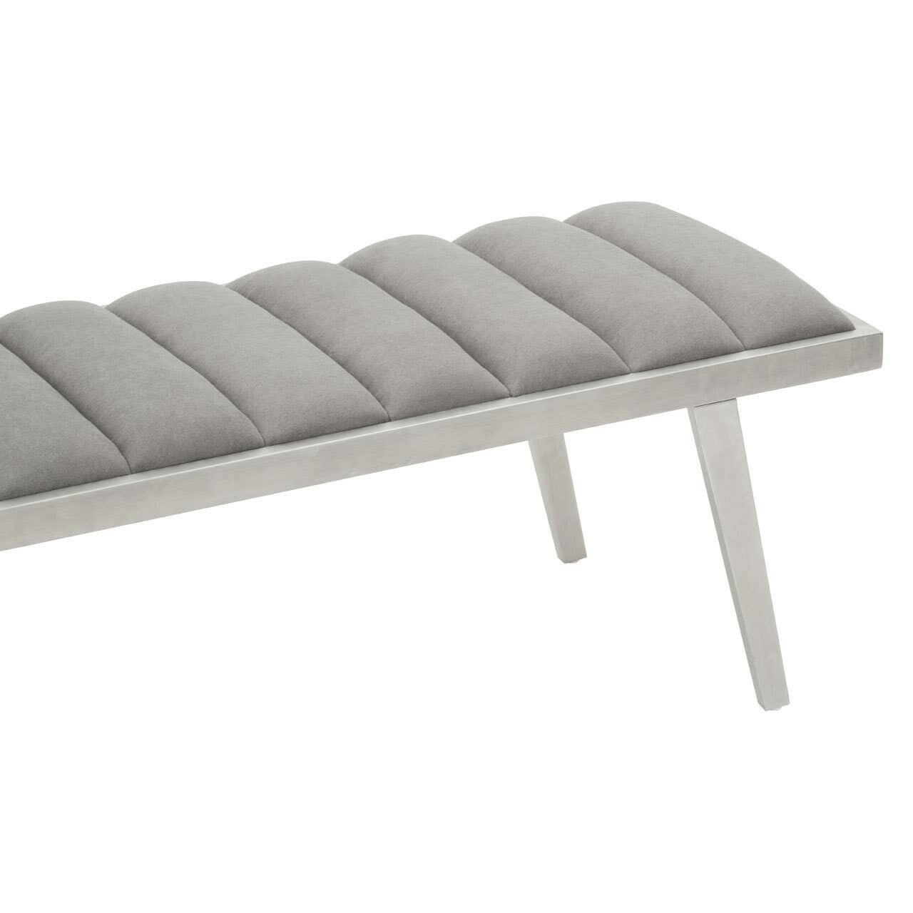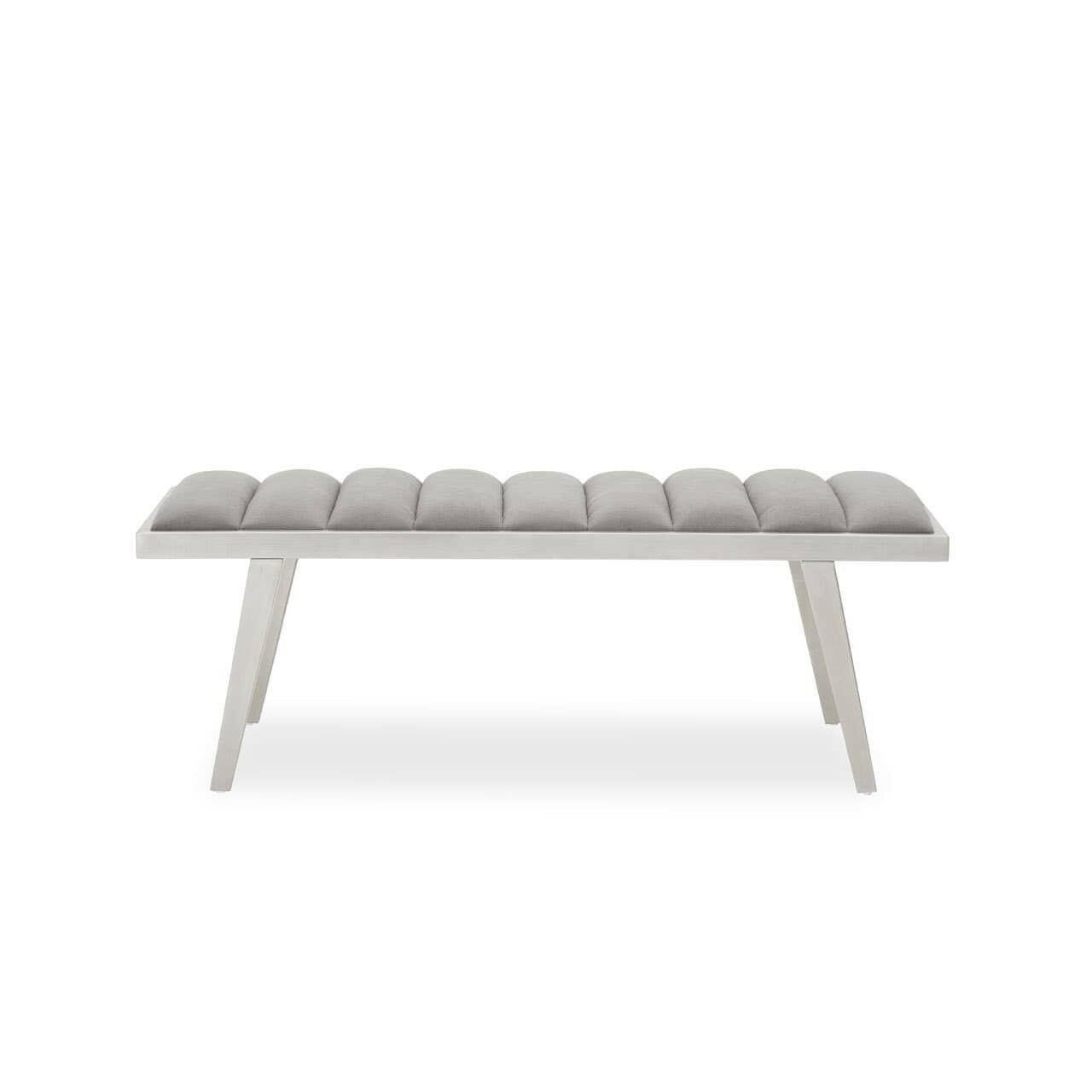 Upholstered in luxurious grey velvet, this bench offers comfortable seating with a channel-tufted seat that forms a decorative texture. The sumptuous seat rests on a brushed silver frame with elegant, splayed legs.
