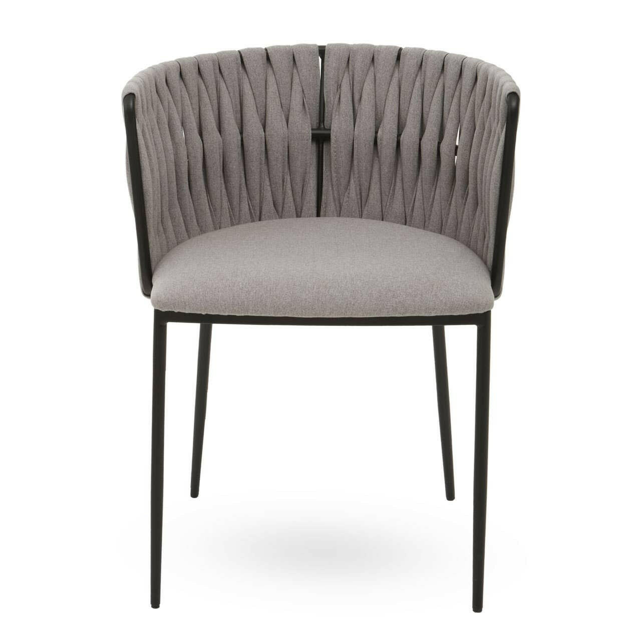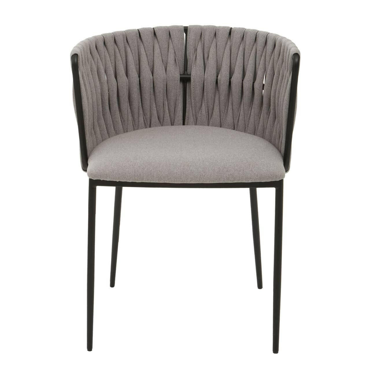 This dining chair has a padded seat upholstered in muted grey fabric. The sumptuous seat matches a curved backrest in a seamless woven pattern. Sleek black finish legs are angled to create mid-century styling.