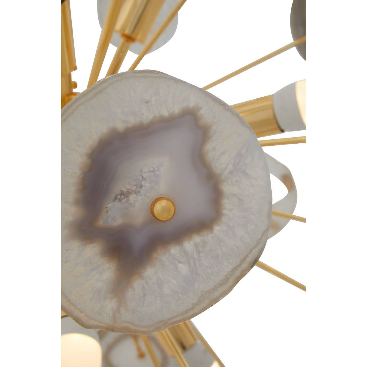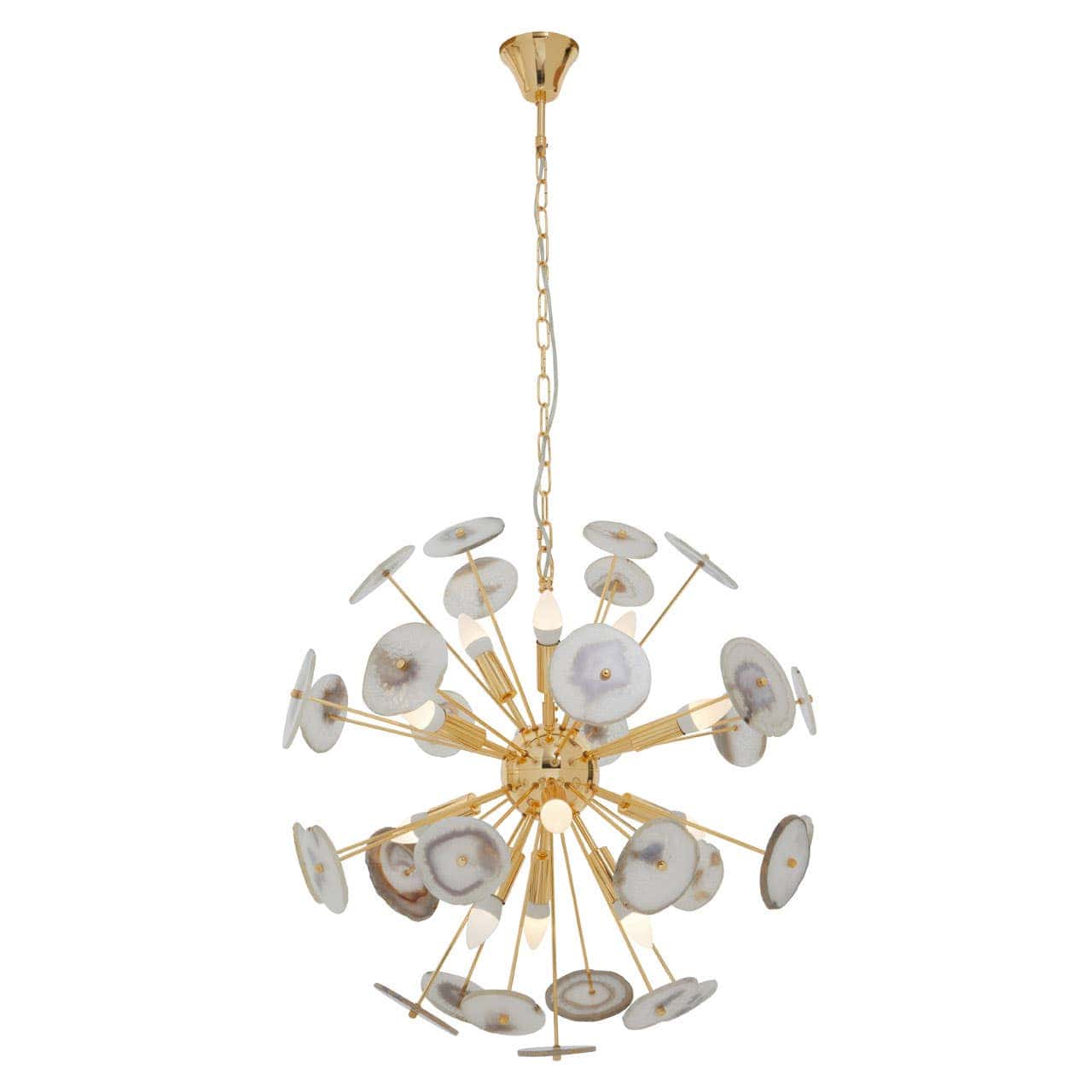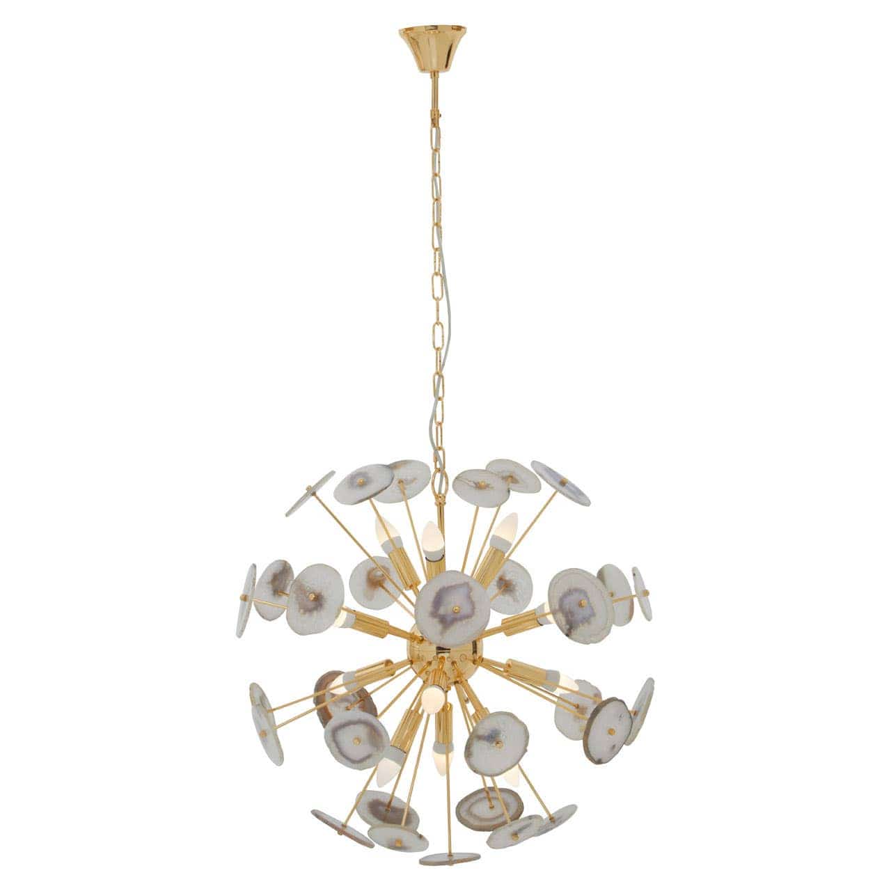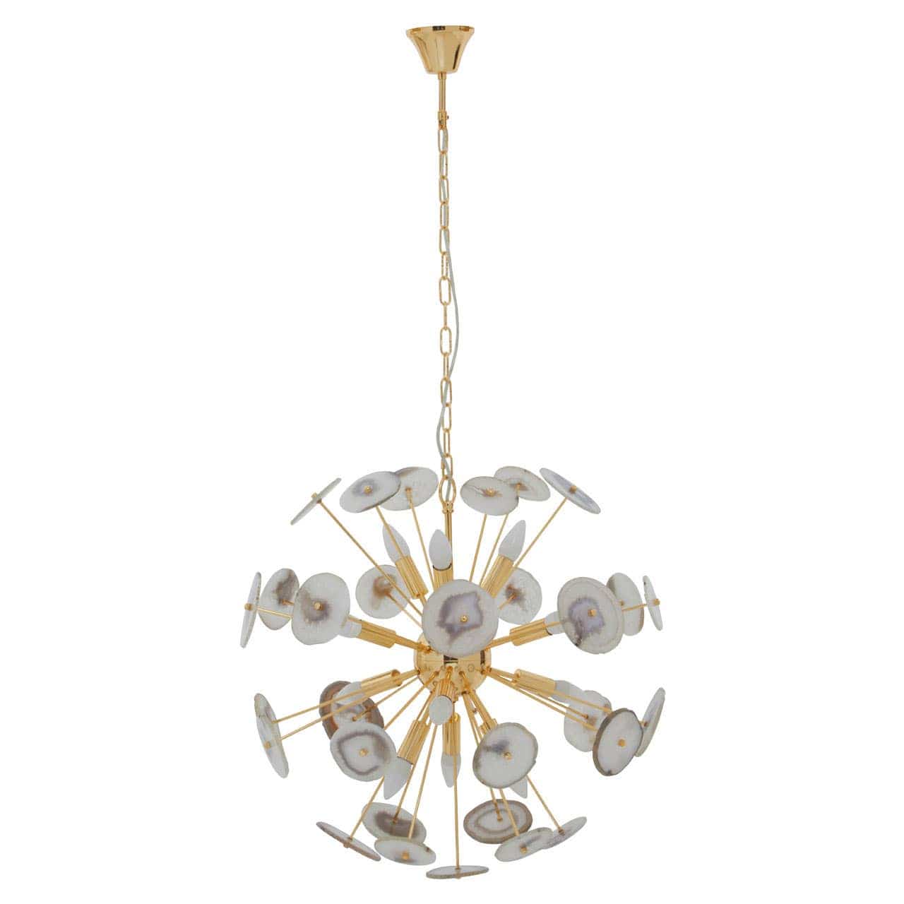 Intricately handcrafted, this contemporary pendant light brings radiance and an organic charm to the living area. Creating a chic statement, the sphere design metal frame features several discs of agate neatly adjusted in front of twelve bulbs.