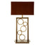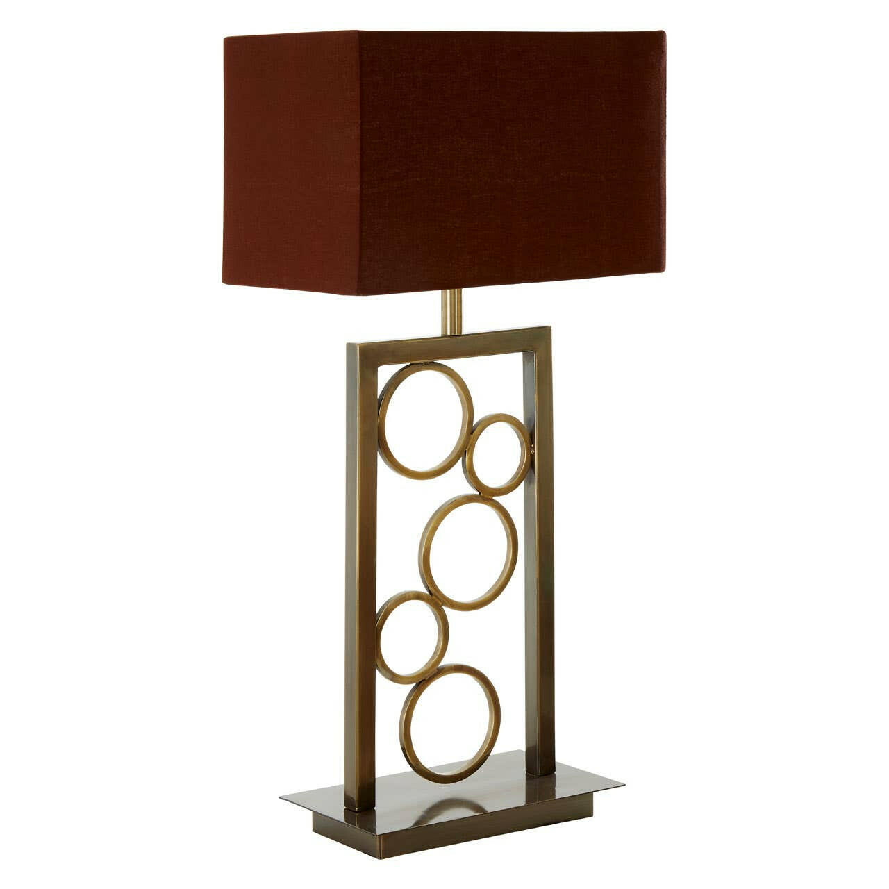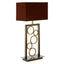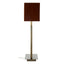 The base is made form smooth stainless steel and has a rich brass finish. A maroon shade, made from soft fabric, complements the brass tone.