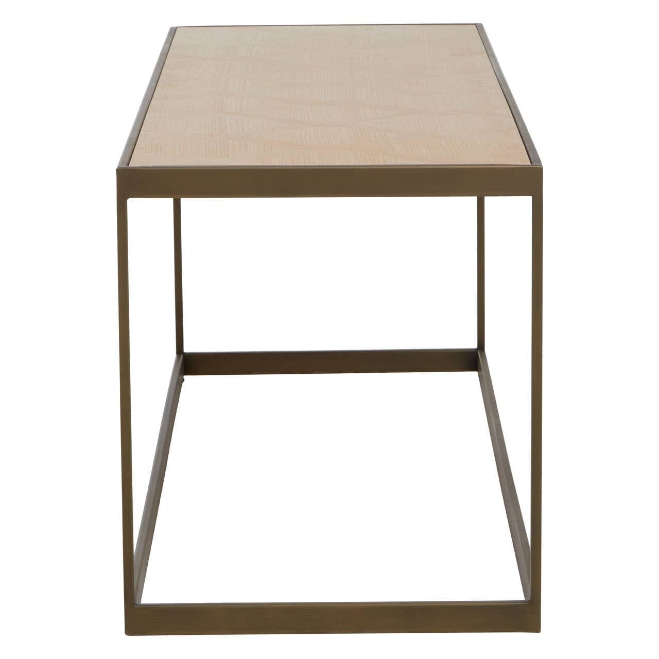 This coffee table exudes elegance with a sleek wood top and steel frame. The open sledge base with a brushed brass finish and the oak veneer wood top elevate visual appeal.