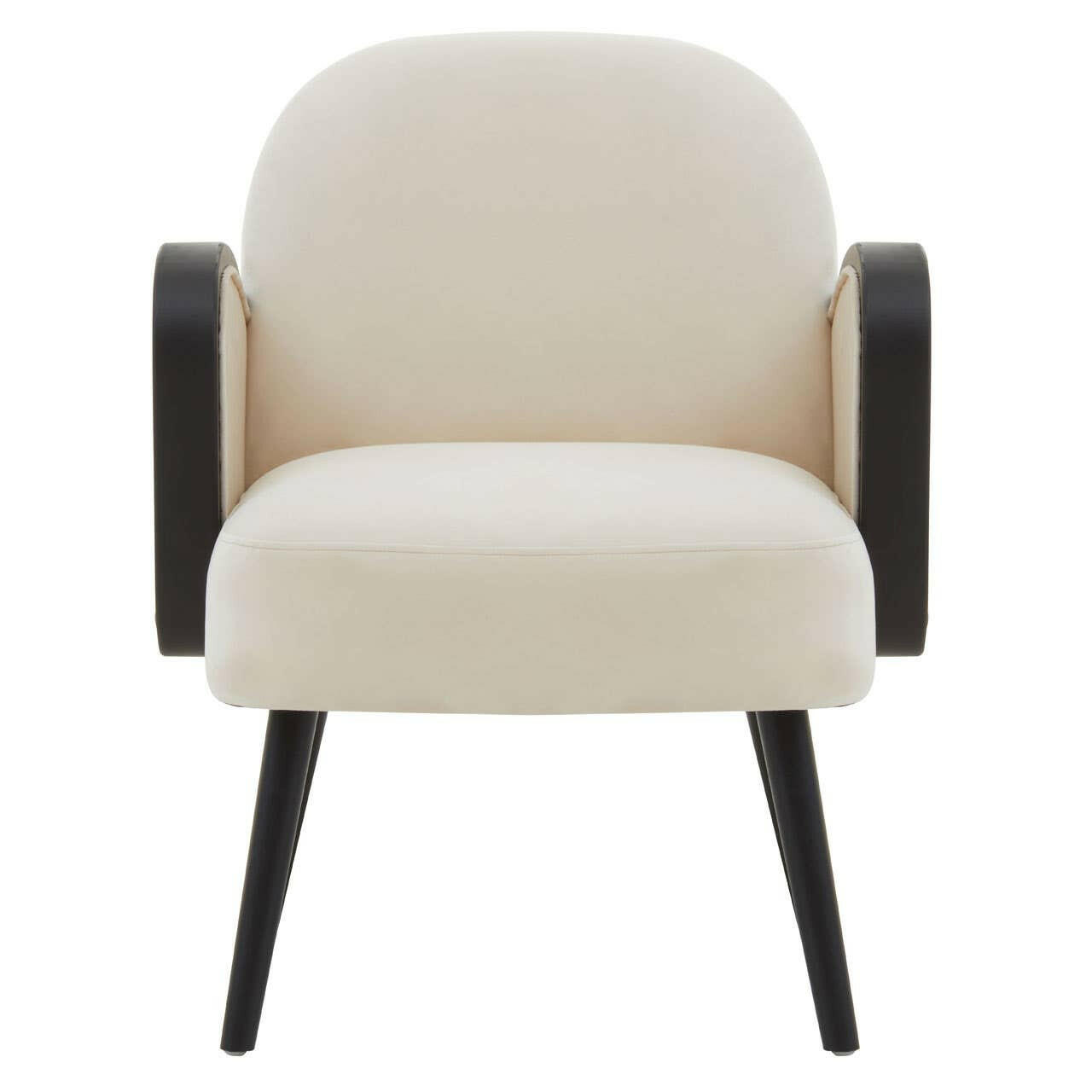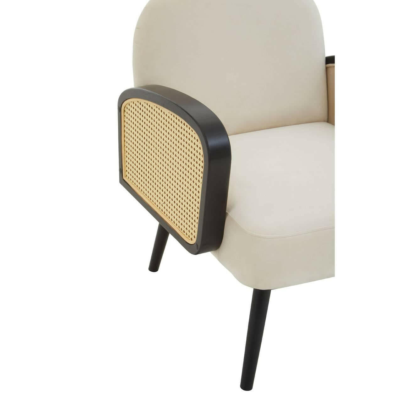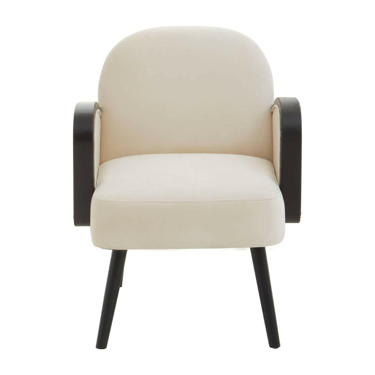This velvet armchair is a sophisticated addition to any seating arrangement since it combines a modern and traditional curved form. It features natural velvet upholstery and sleek black wooden legs.