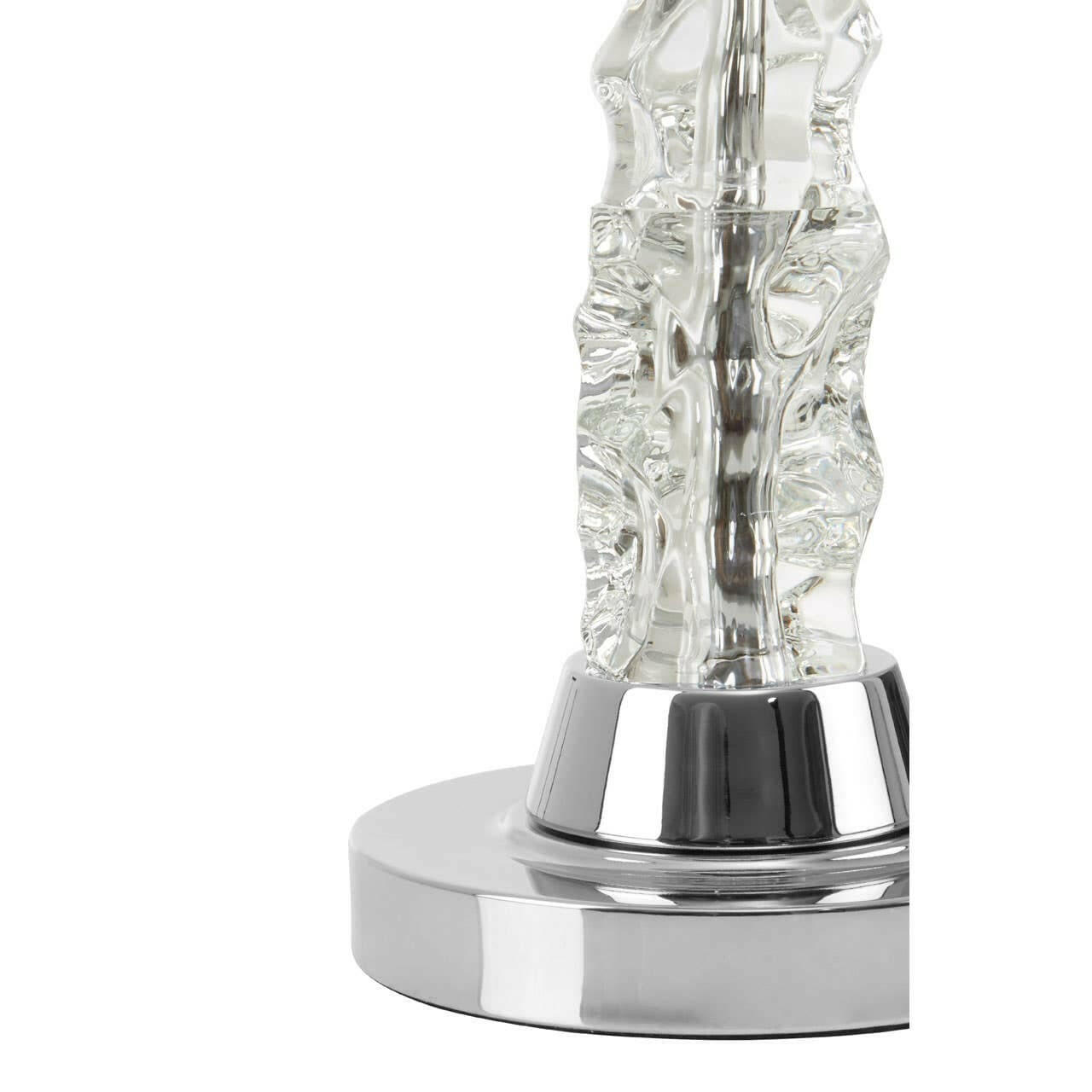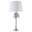 This table lamp has a chrome finish body which is textured with crystals and leaves to resemble a palm tree design. The chic white tapered contrasts the lamp’s intricate and sculptural base. This lamp in luxe metallic accent will set a tropical atmosphere with its tree design in a boutique hotel setting.