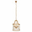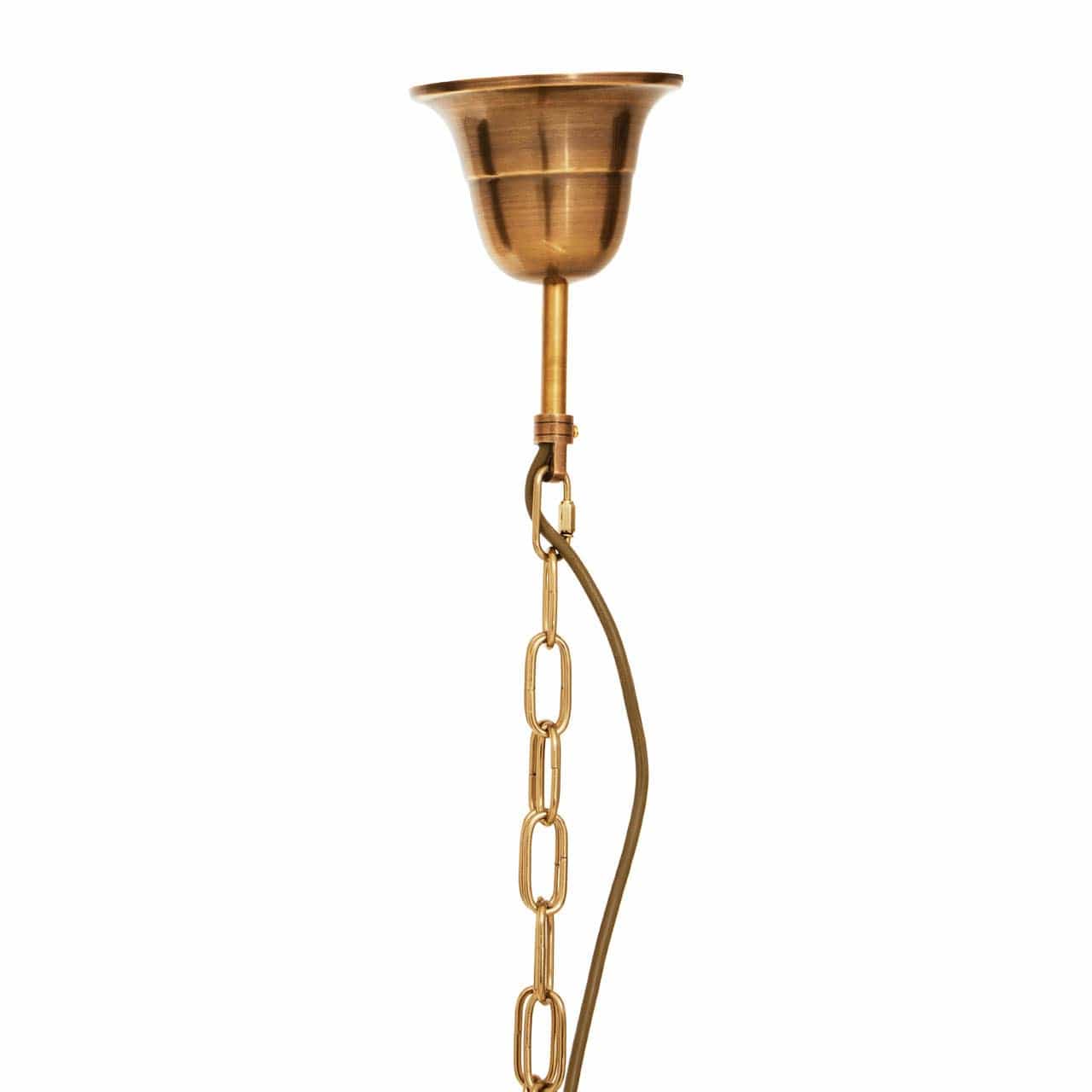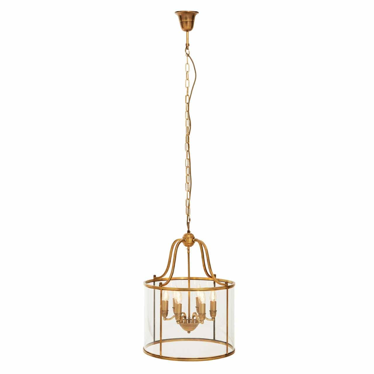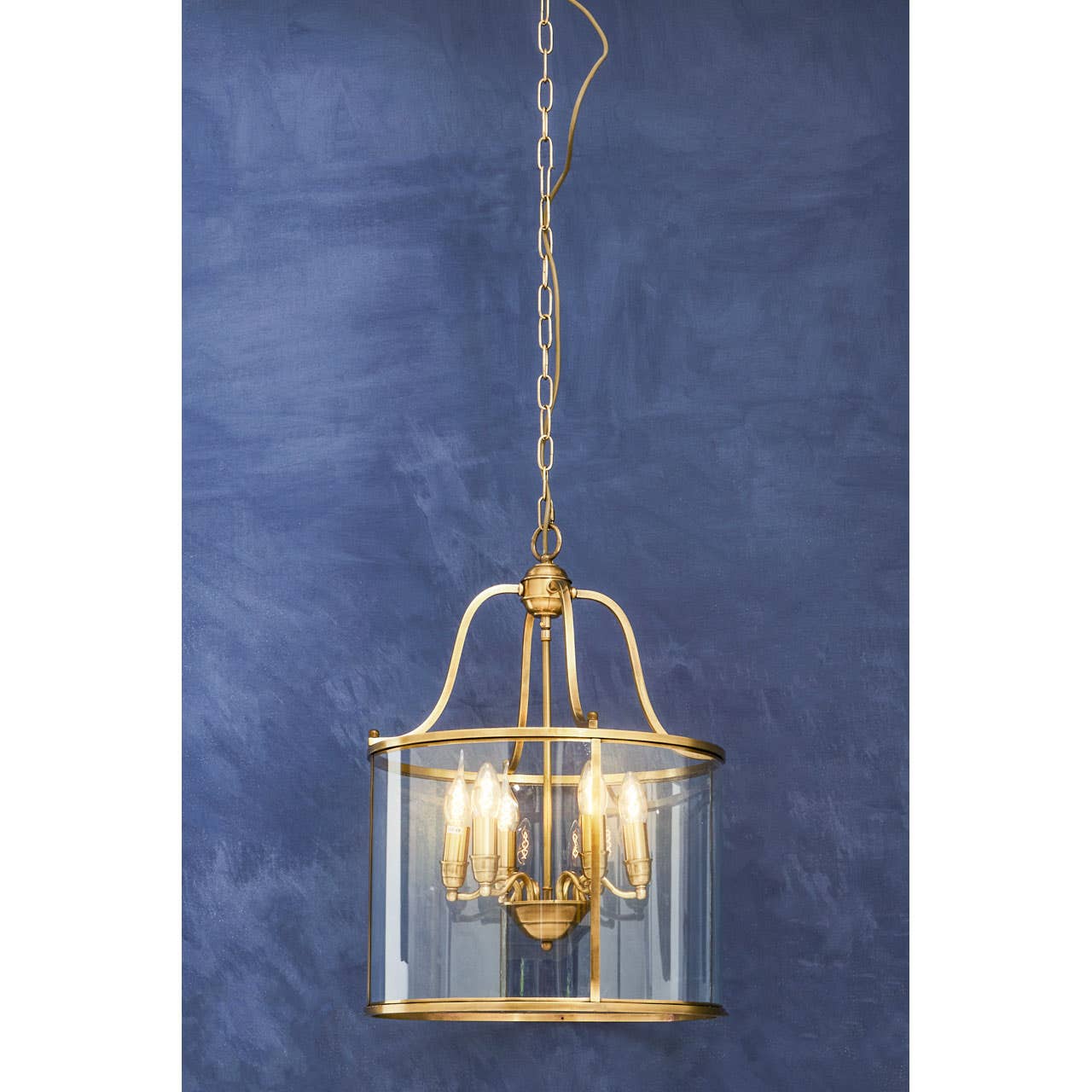This four-pronged pendant light is attached to an adjustable chain and features a circular profile. Skilfully handcrafted, the clear glass panes are adjusted neatly in the brass finish frame allowing the six bulbs to lend a warm glow in the living area.