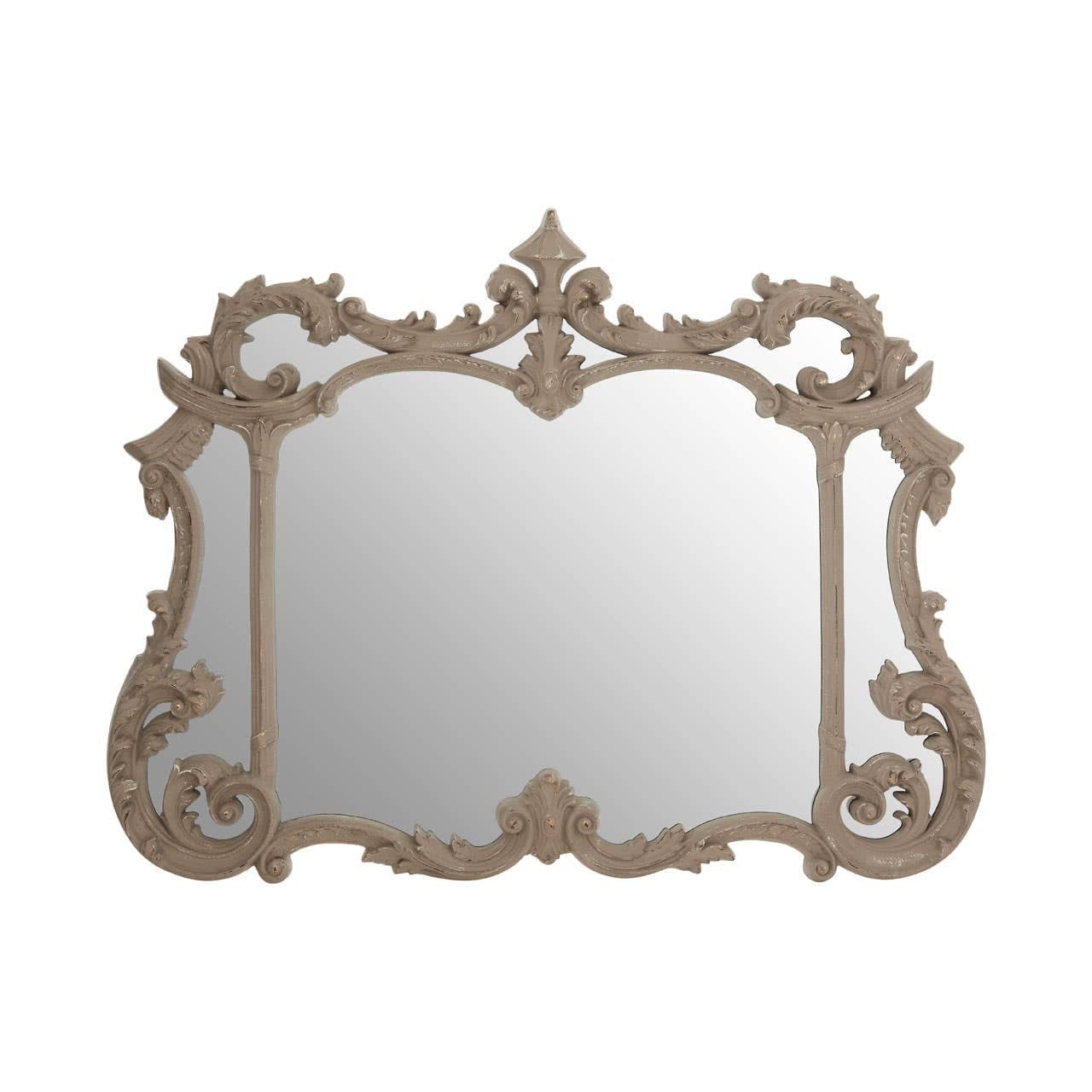 Its stately frame has an antique grey finish which is weathered to help emphasise the decorative detail. The frame spreads itself outwards via curling acanthus leaf motifs that form around a pointed finial at the top.