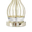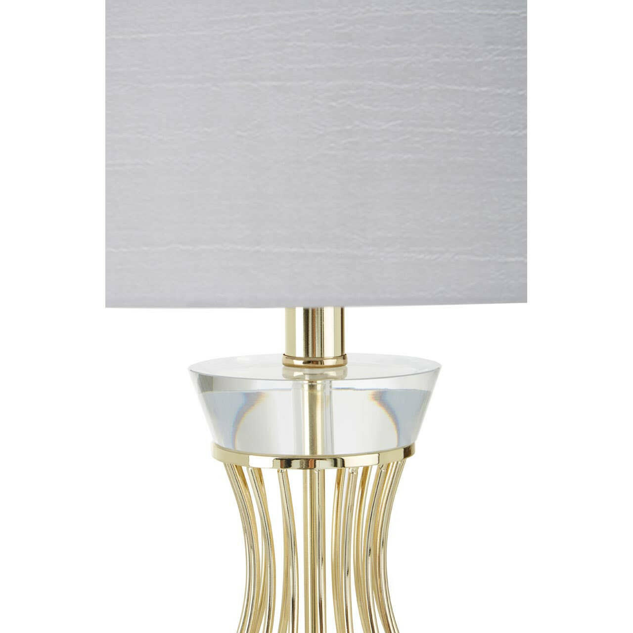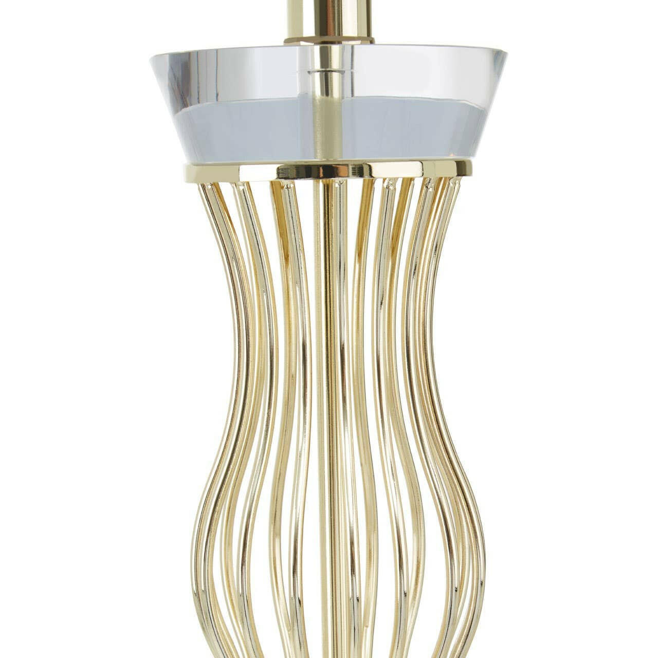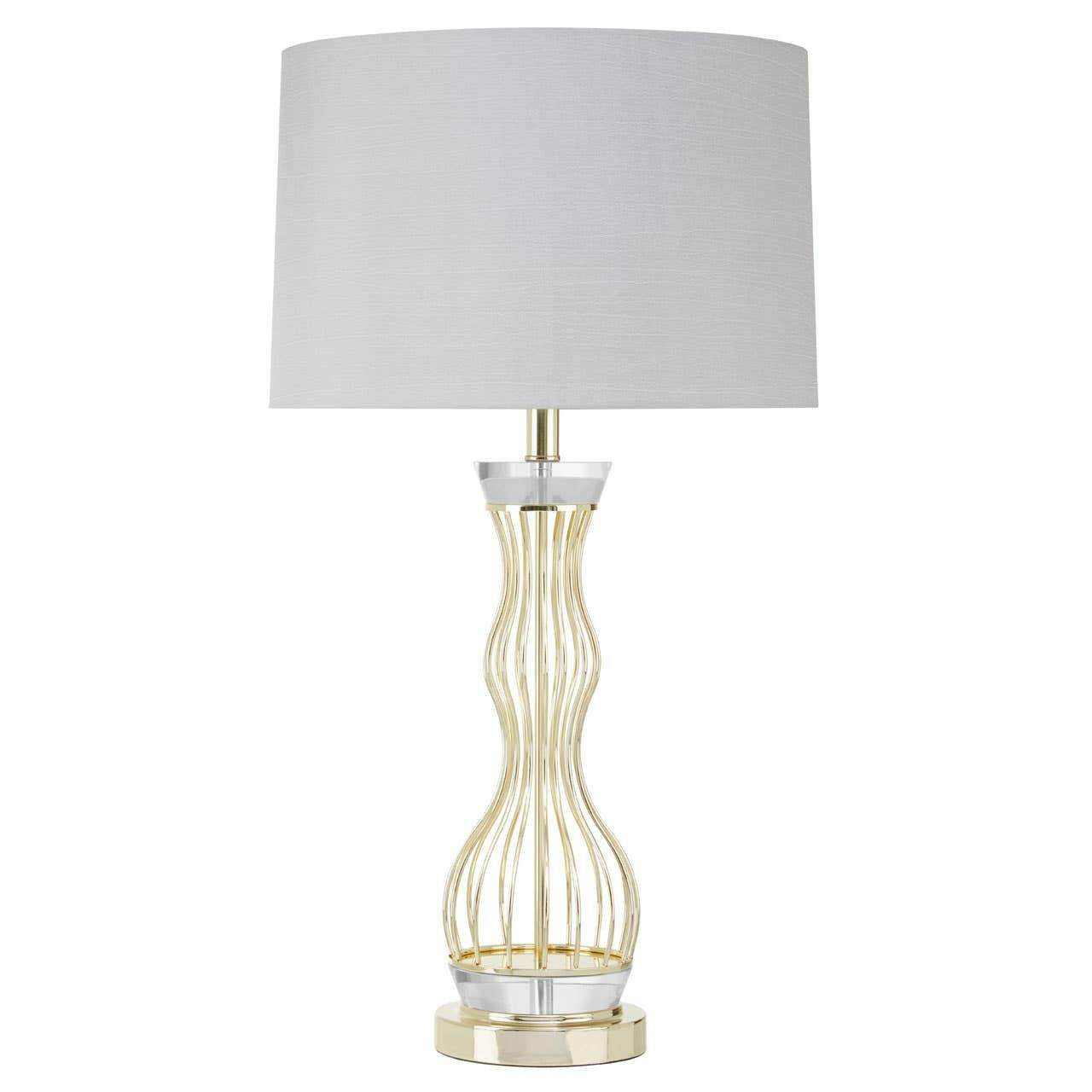 This table lamp has a curvaceous base crafted from metal wires and given a rich gold glaze to add a striking appeal. It is attached to translucent crystal bands on each side and rests on a round metallic bottom. The grey fabric shade will create an ambient glow by refracting light on its glitzy, open style base.