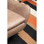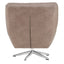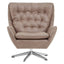 The Harold chair has a grand, sweeping design and is supported by a metallic silver swivel base. The large seat is dressed in soft, light brown faux leather. The button tufting on its high back gives it a textured look.