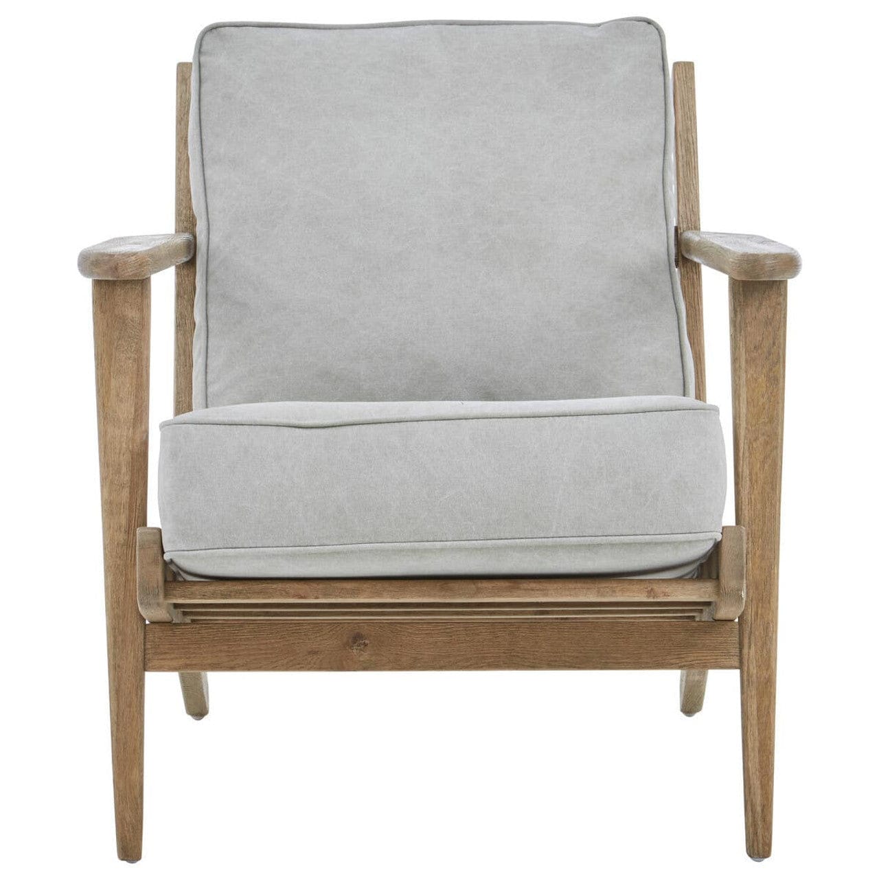 This chair is made from american oak and features a reclined frame with a laid back asthetic. The frame with a slatted back supports a removable seat and back, each covered in a grey wash linen fabric with minimal trim adorning the sides.