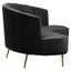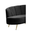 Upholstered in black velvet, this three-seat sofa highlights clean-line stitching with a pleating effect on the back. Elevated by slanted metal legs in the warm metallic finish, the curved shape of this sofa will make a luxe statement in the living area.
