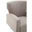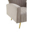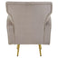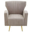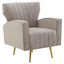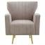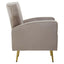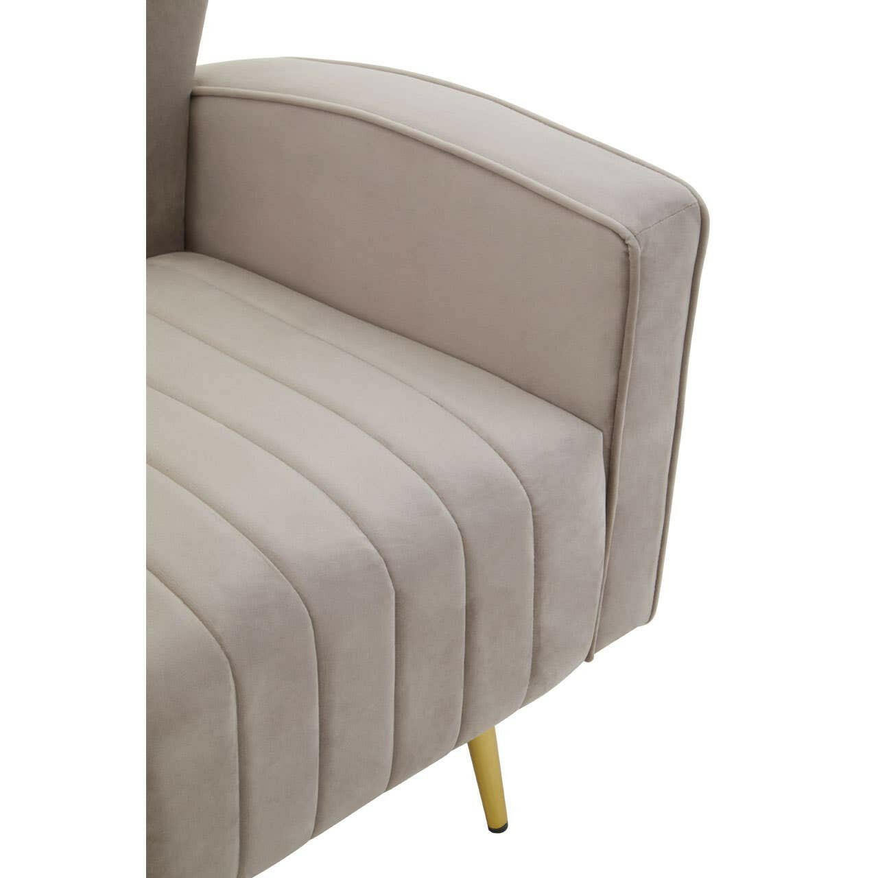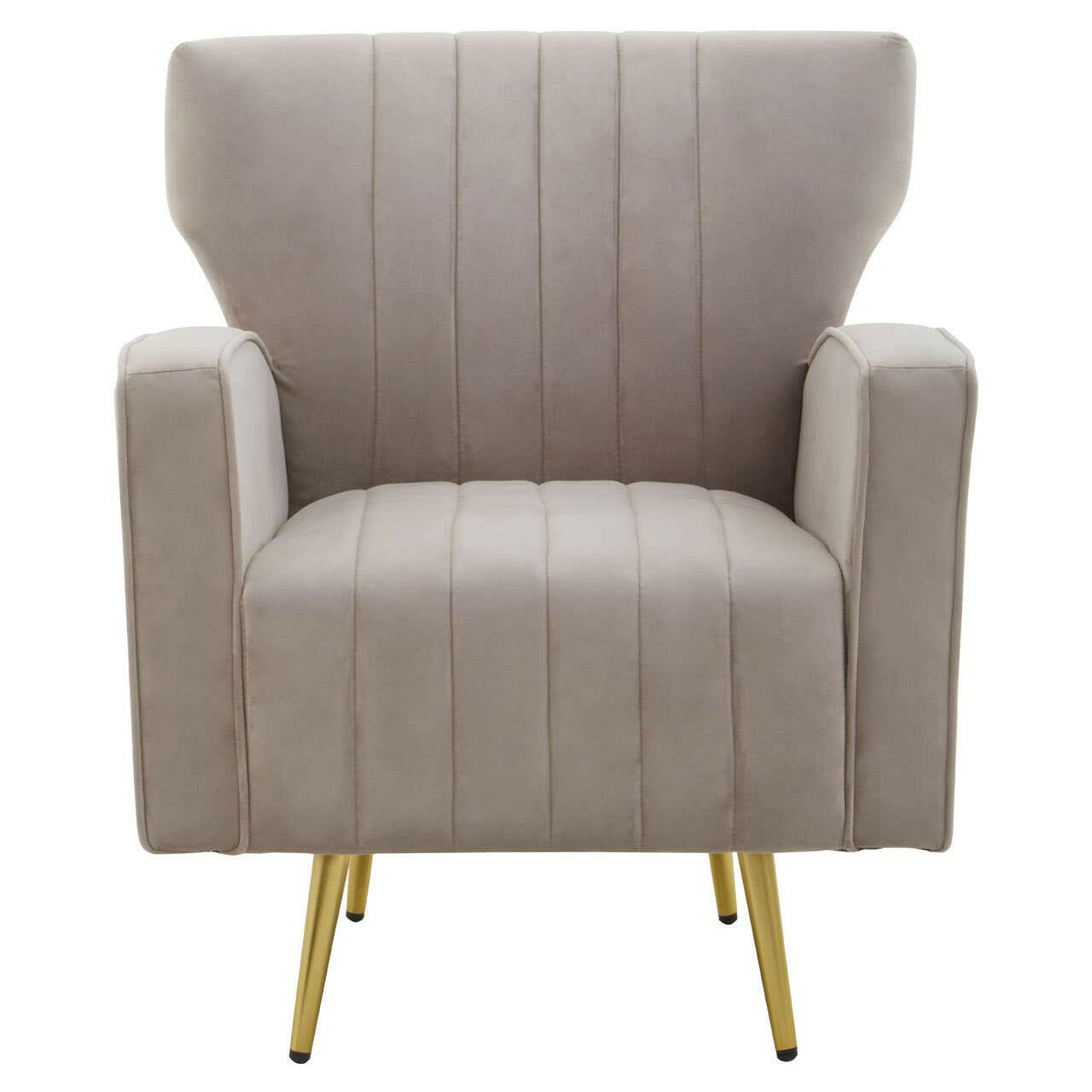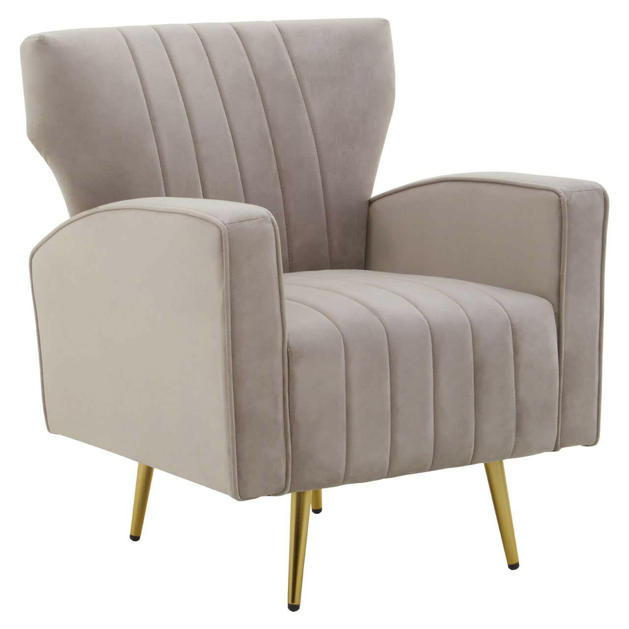 This armchair has a modern retro style due to the winged back and a seat upholstered in mink velvet. The sumptuously padded seat has channel tufting that lends detail and texture to the design, which is supported by gold finish metal legs.