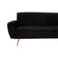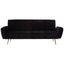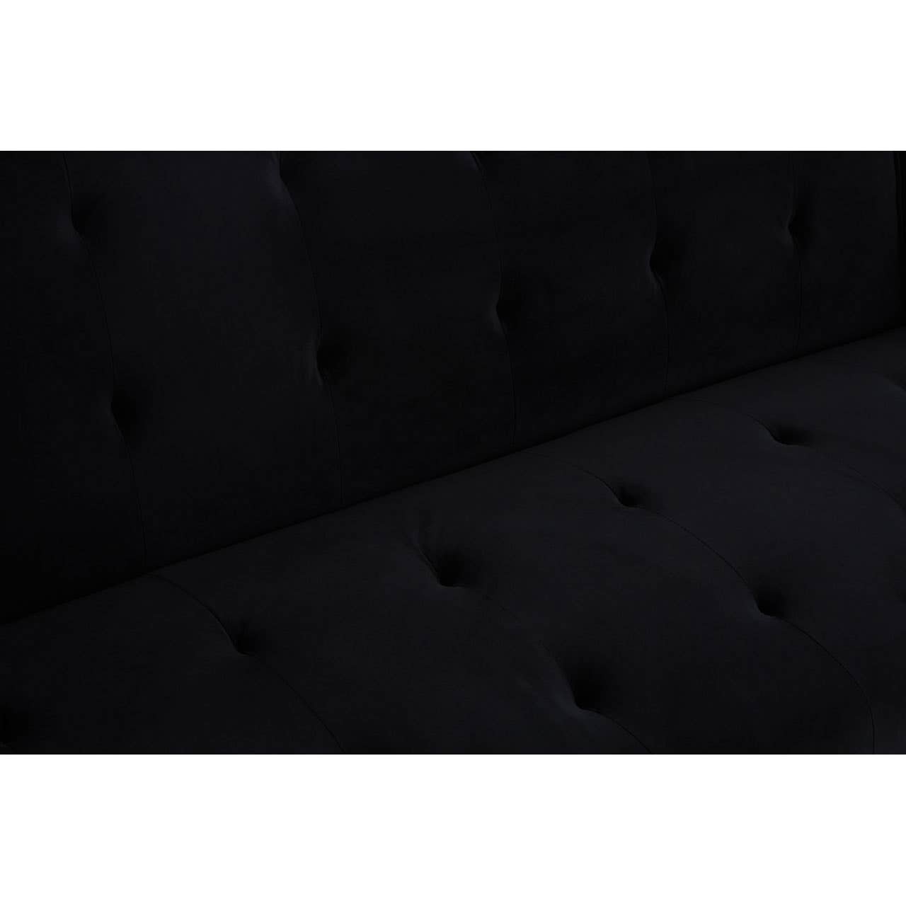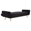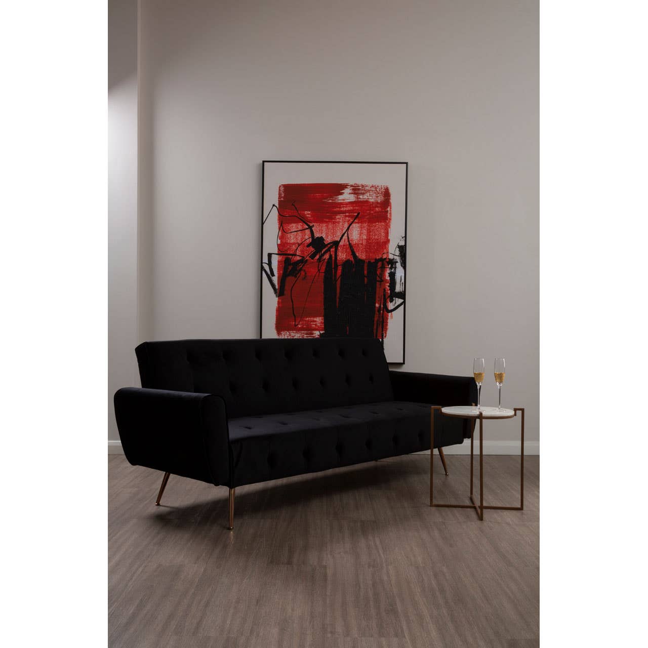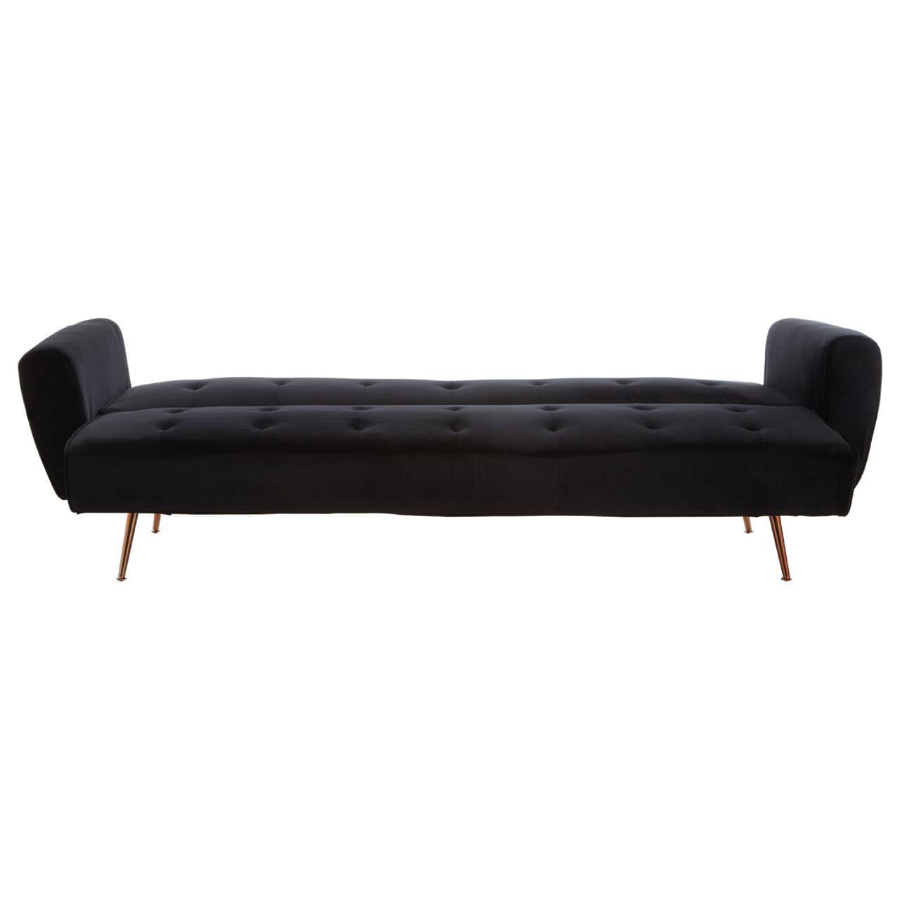 This chic sofa bed is upholstered with sumptuous black velvet. The button tufting that textures its seat and backrest offers a nod to traditional style, but the restrained design lines make a contemporary statement. The backrest lowers to extend the sofa into a comfortable place to repose. Its minimal legs have a warm gold finish to complement the black.