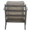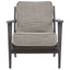 This chair uses black American oak to create a reclined frame with a slatted backrest. The frame features the striking grain that this type of oak is renowned for. Plump cushions cover the seat and backrest, each one upholstered with textured tweed.