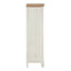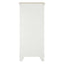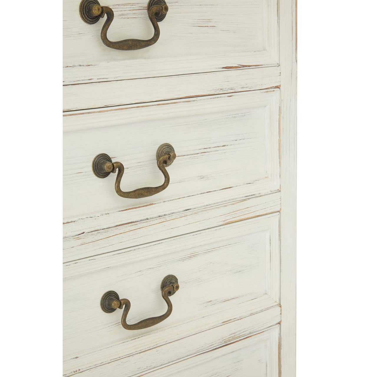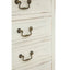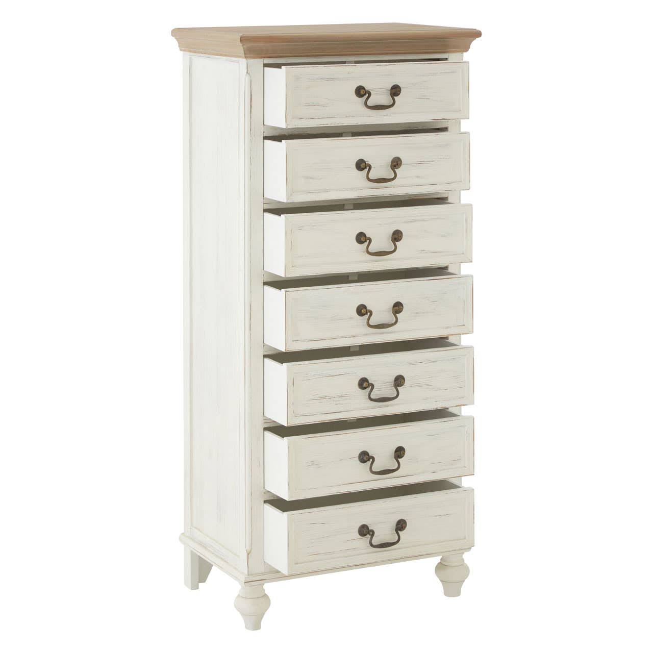 This Shaker-style cabinet features an exquisite bevelled top, its fir colouring complementing the white. Crafted from eco-friendly paulownia wood, the cabinet boasts decorative carved detailing, notably at the feet and on each of the seven drawers. The handles are embellished with antique design, their brass finish coordinating with the fir.