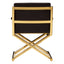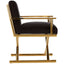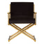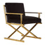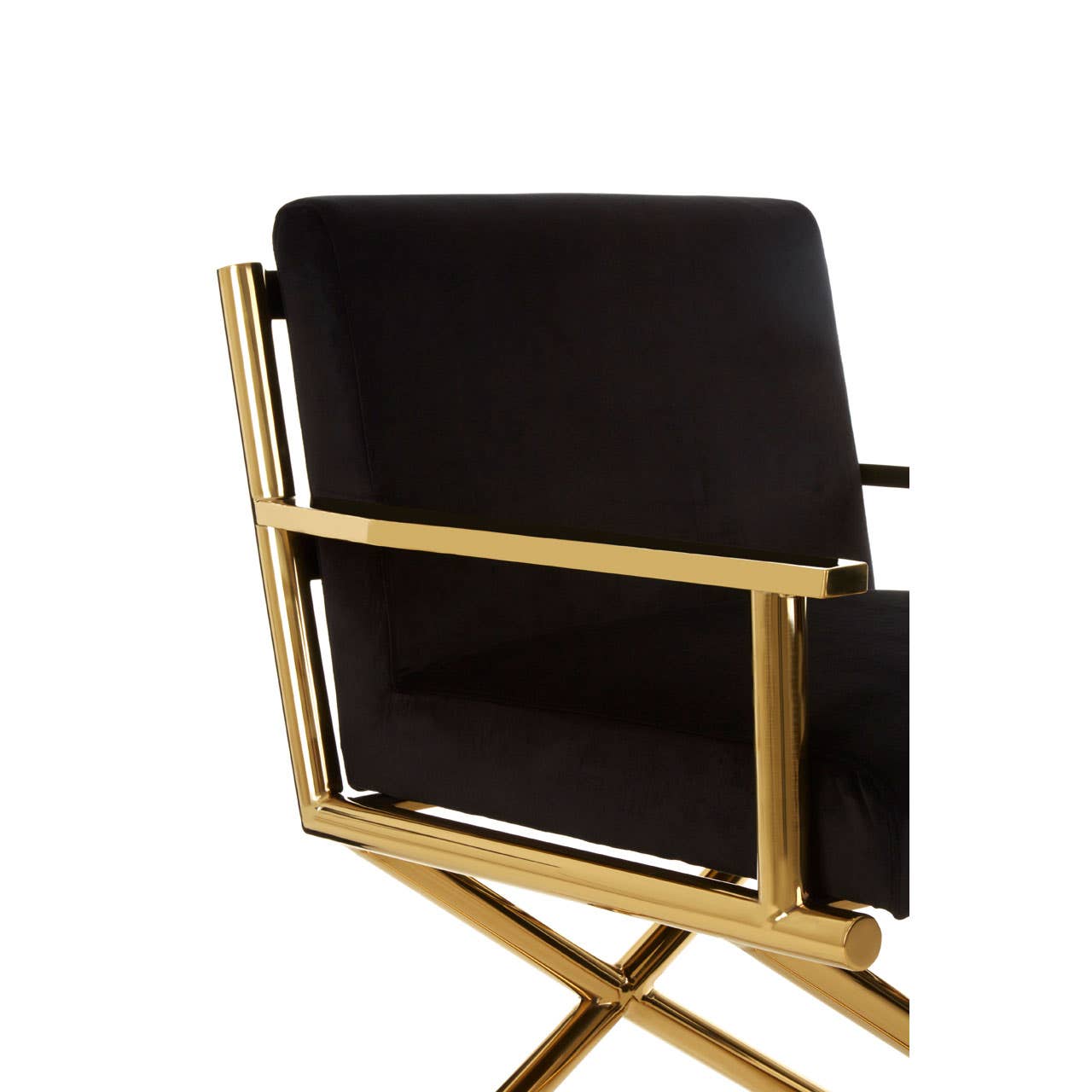 The Hendricks chair takes its design cues from the glamorous directors chairs of Hollywood. The comfortable padded seat is upholstered in dark black velvet that feels luxurious to the touch. The smooth stainless steel frame features a cross-design base and simplistic armrests and is finished in a rich tone of gold.