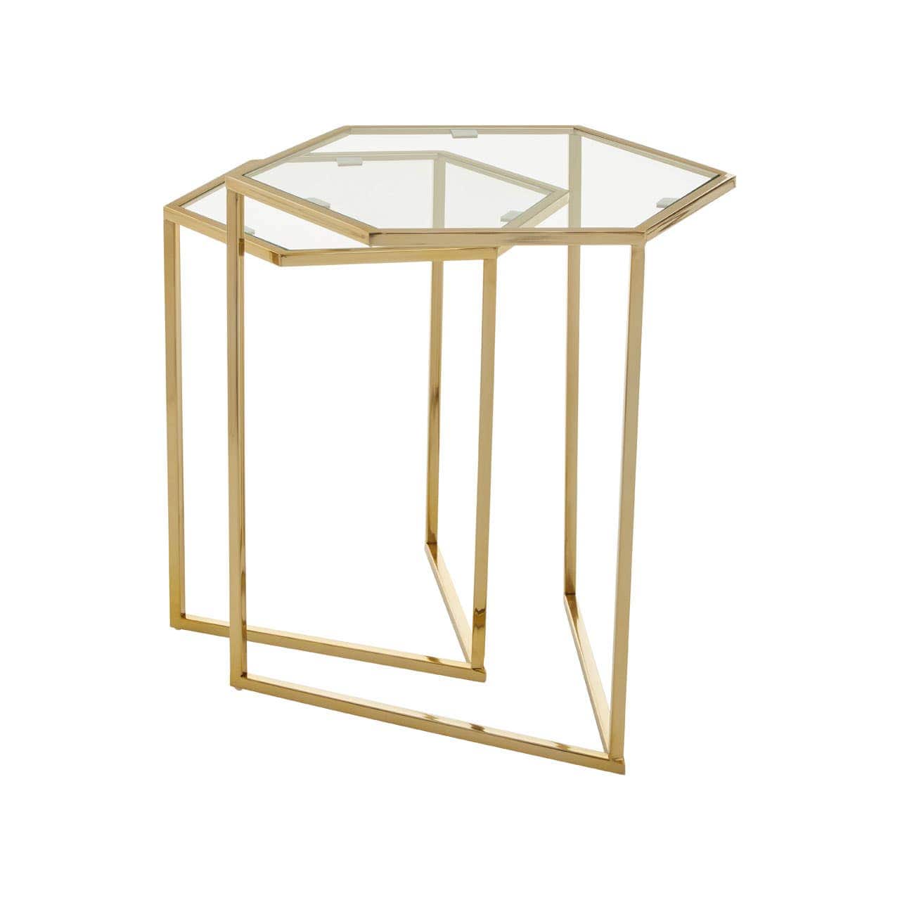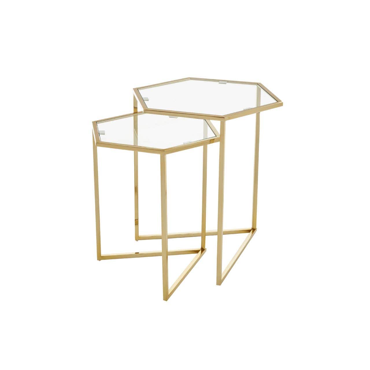 This set of two tables has a stackable design that offers compact storage. Made from warm gold finish steel, each table features clean lines which bend to form a hexagonal top with mirrored glass insert and an open triangular base.