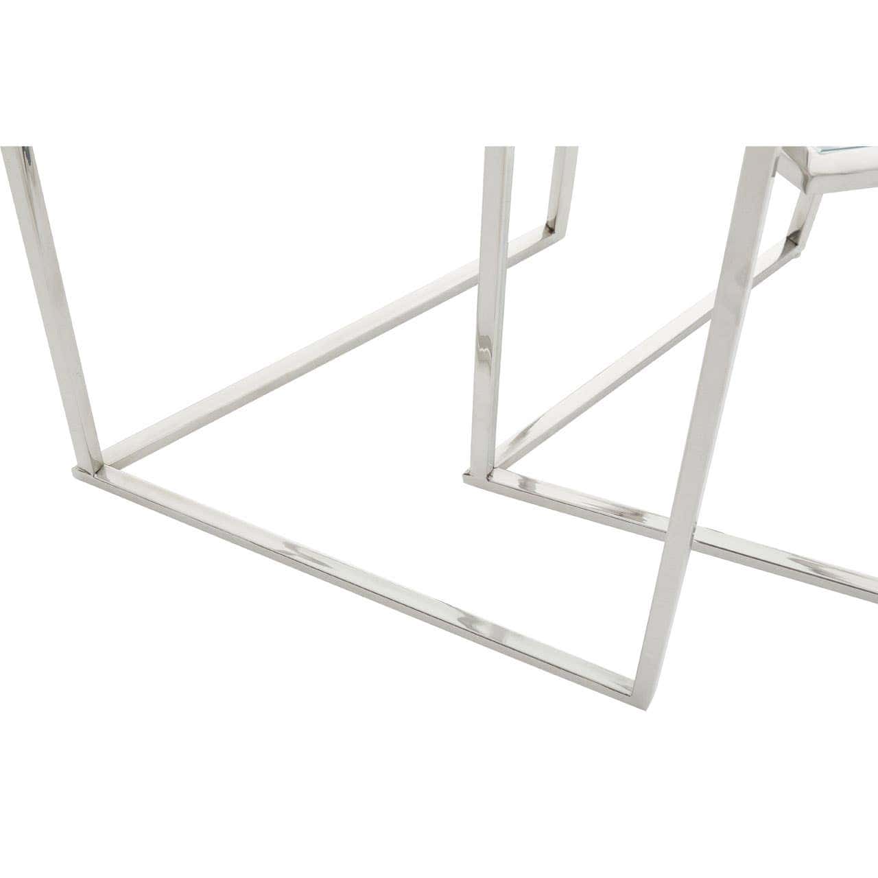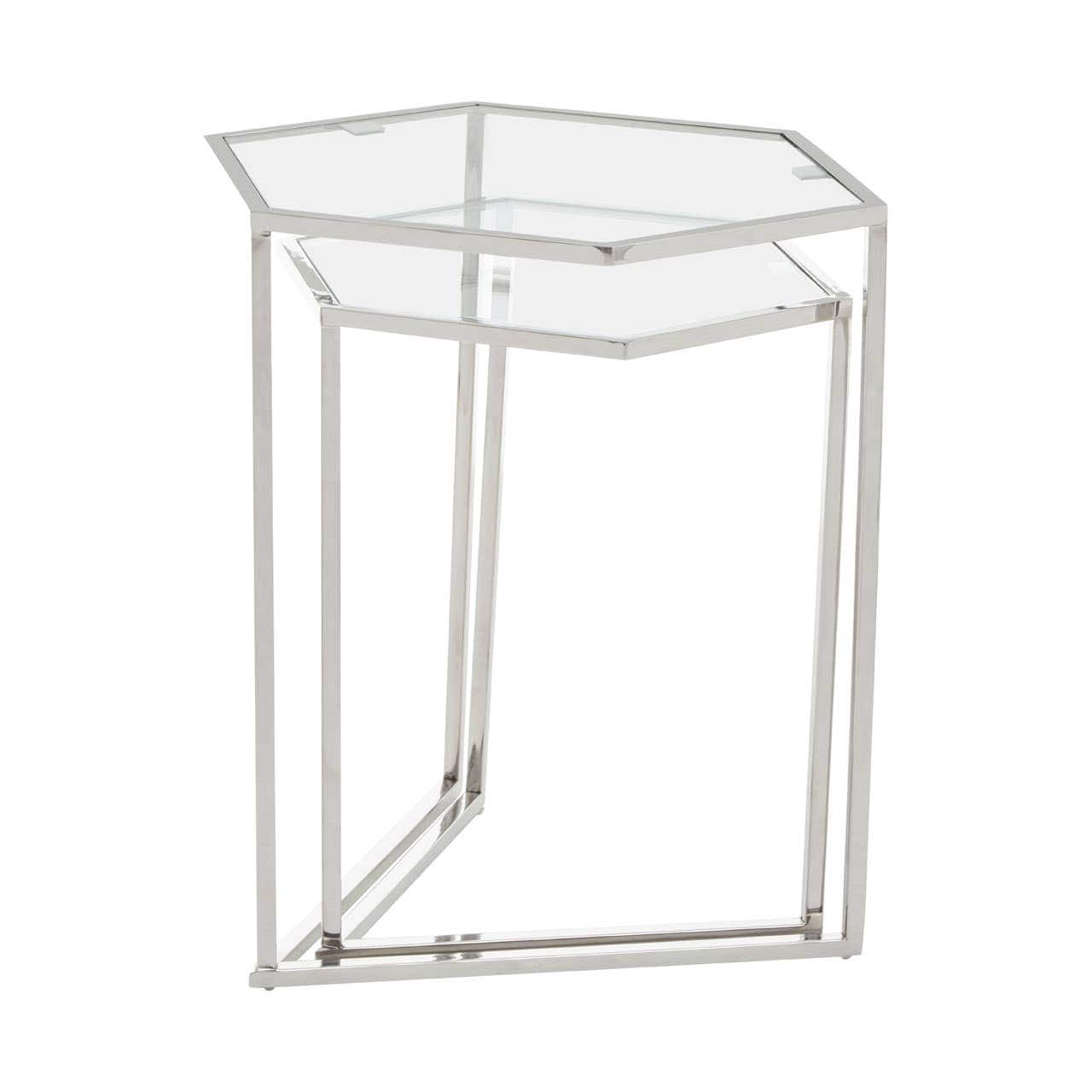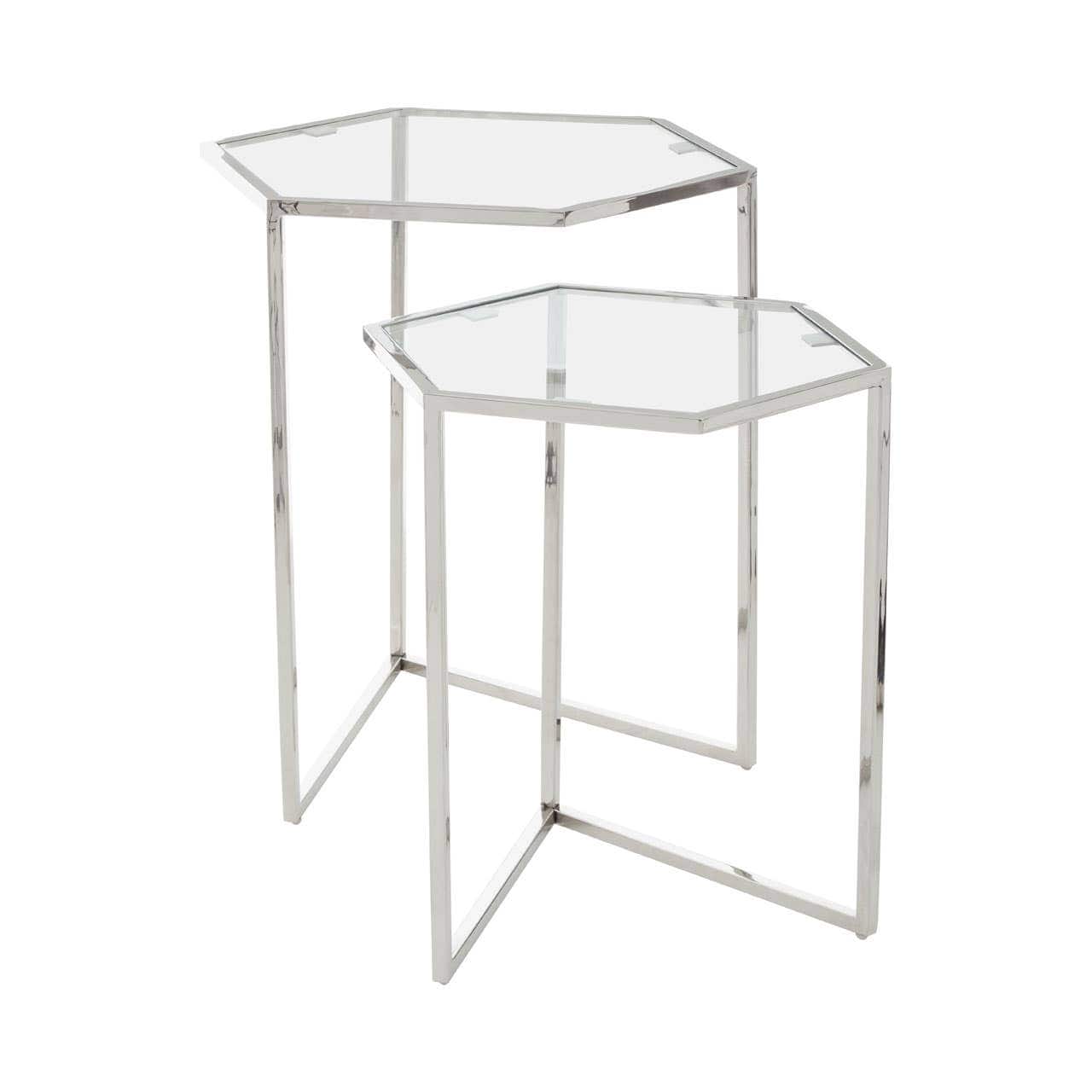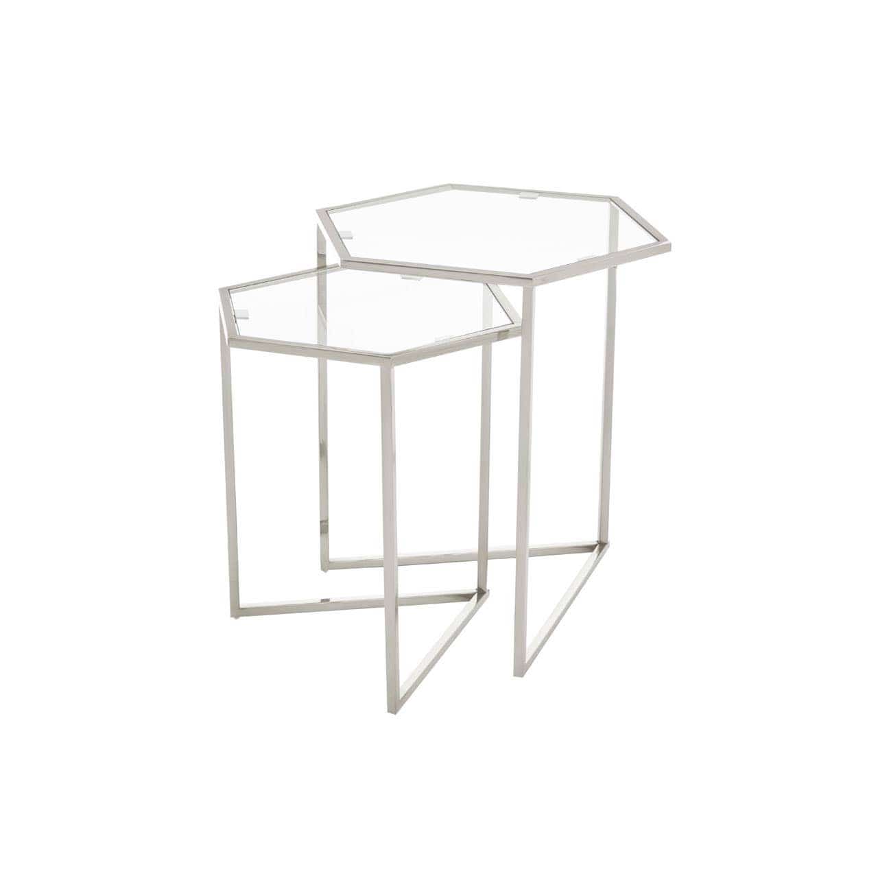 This set of two tables has a stackable design that offers compact storage. Made from silver finish steel, each table features clean lines which bend to form a hexagonal top with mirrored glass insert and an open triangular base.