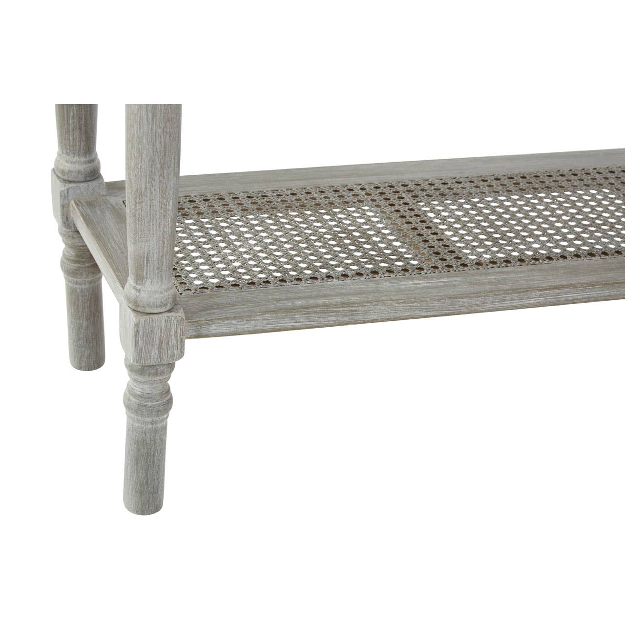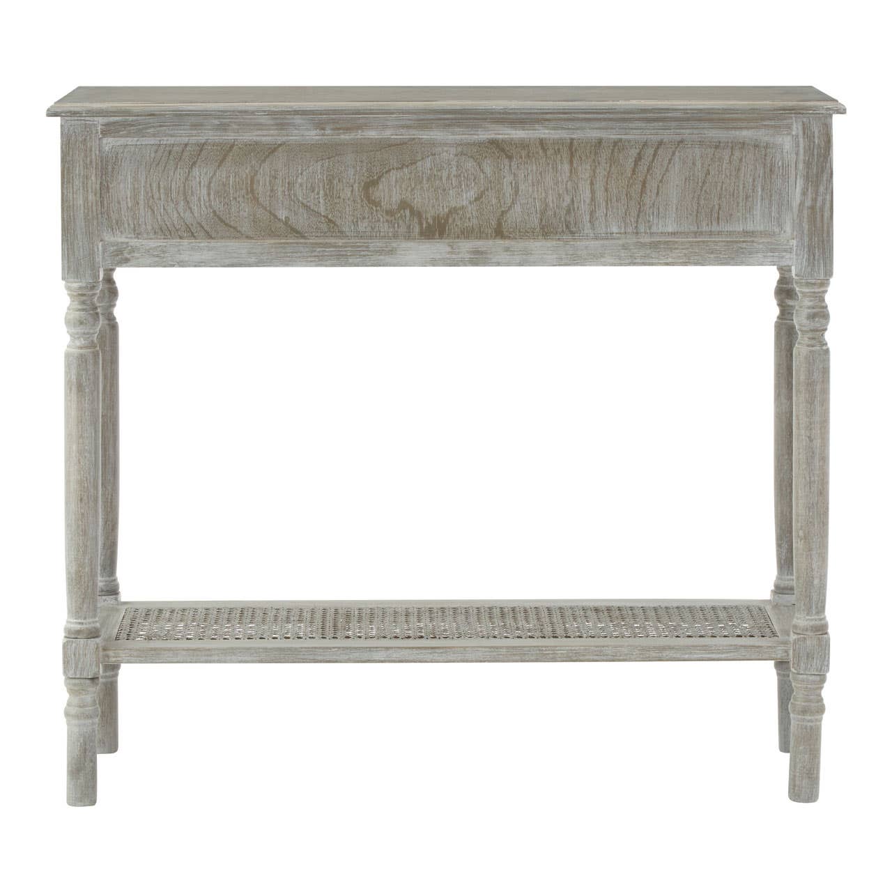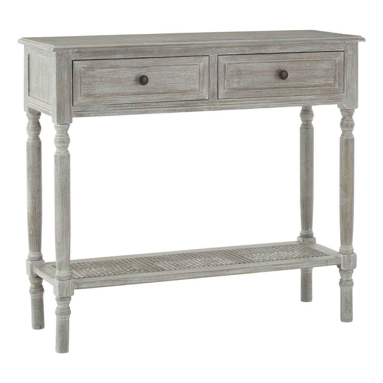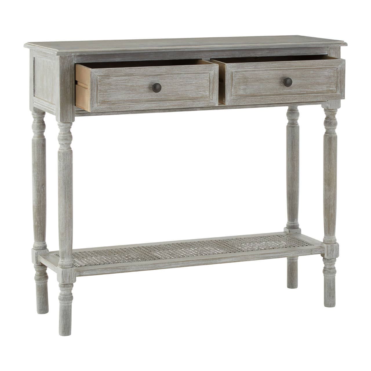Its four slim legs feature carved detail which corresponds with the bevelled edges on the tabletop and drawers. A pair of drawers provides concealed storage, each one decorated with a round metal handle. The latticed shelf which sits just above the feet of this colonial style console table provides additional storage and display space.
